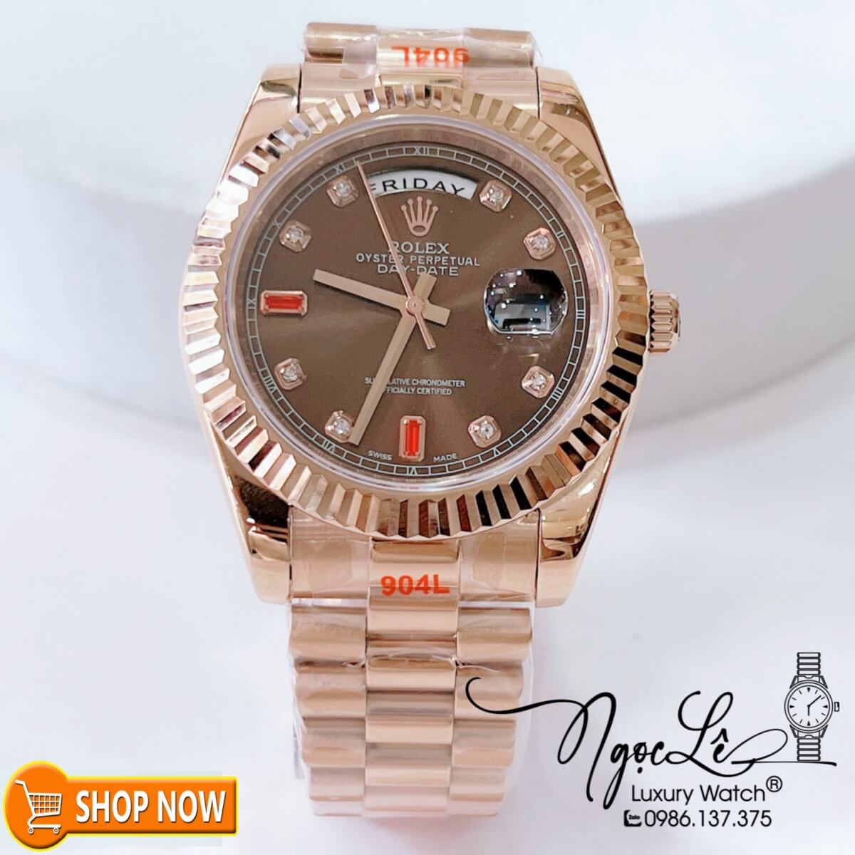 Đồng Hồ Rolex Day-Date Nam Máy Cơ Tự Động Dây Vàng Hồng Mặt Nâu Size 41mm