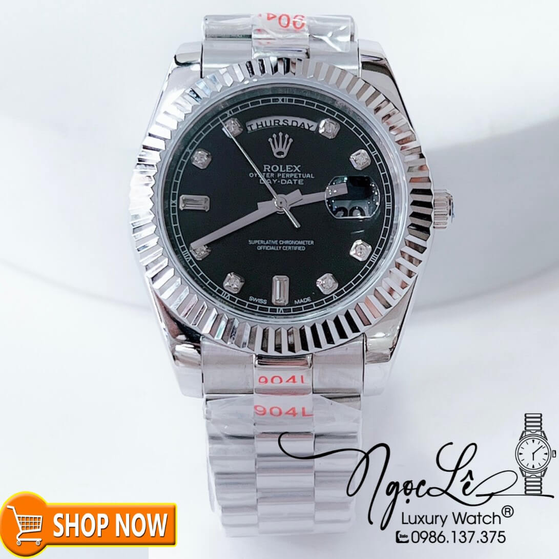 Đồng Hồ Rolex Day-Date Nam Máy Cơ Tự Động Dây Bạc Mặt Đen Size 41mm