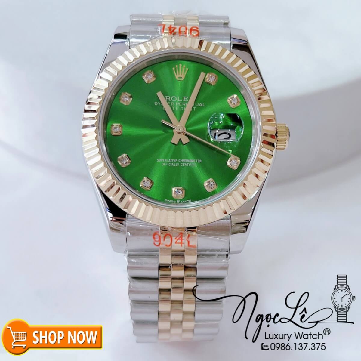 Đồng Hồ Rolex Datejust Nam Máy Cơ Tự Động Dây Demi Vàng Mặt Xanh Lá Gợn Sóng Size 41mm