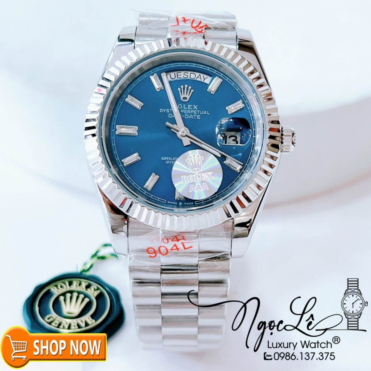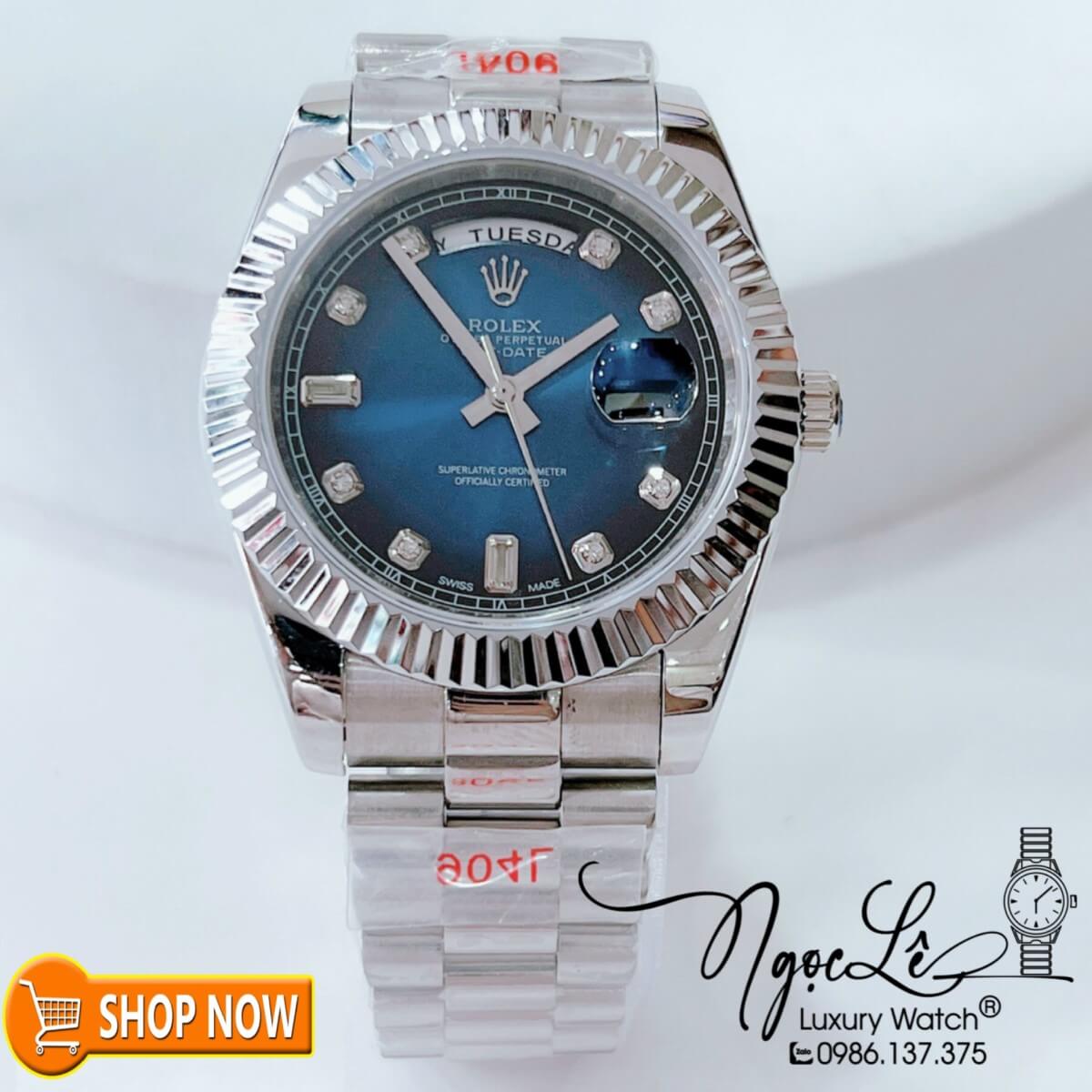 Đồng Hồ Rolex Day-Date Automatic Nam Dây Bạc Mặt Xanh Dương Size 41mm Vạch Đá