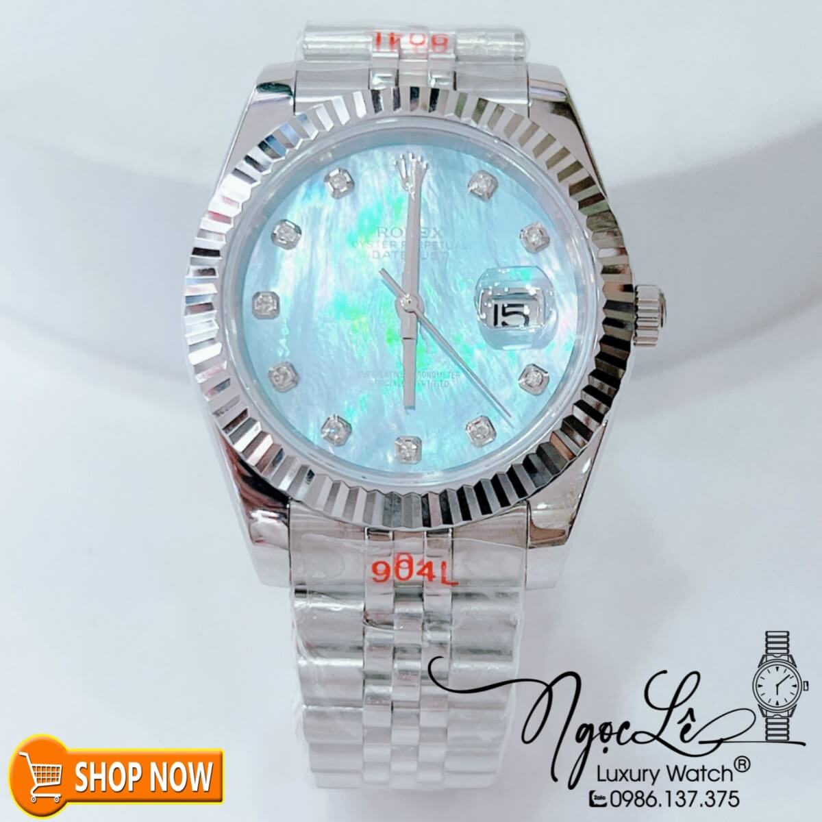 Đồng Hồ Rolex Datejust Nam Máy Cơ Tự Động Dây Bạc Mặt Xanh Xà Cừ Size 41mm