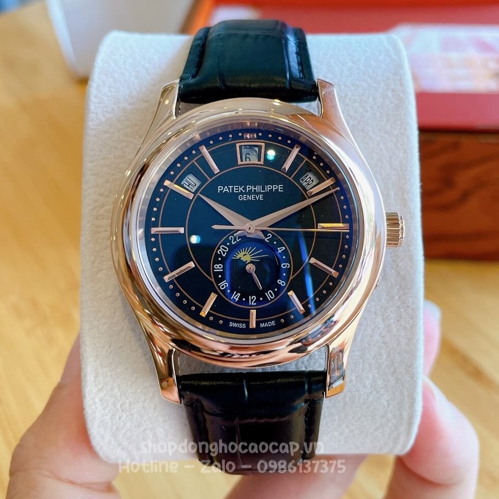Đồng Hồ Patek Philippe Nam Cơ Tự Động Dây Da Đen Mặt Xanh Vỏ Rose 40mm