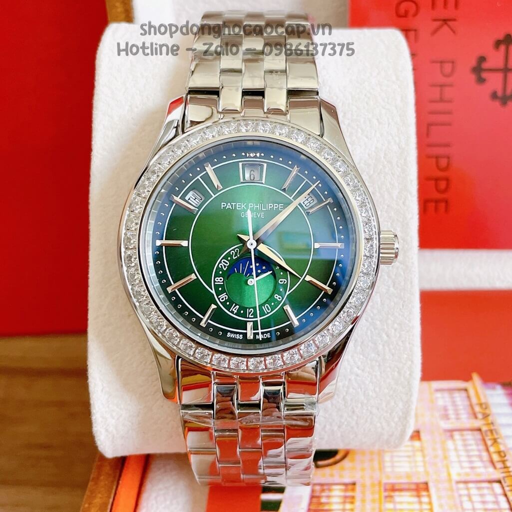 Đồng Hồ Patek Philippe Nam Cơ Tự Động Dây Da Xanh Silver Viền Đá Ống 40mm