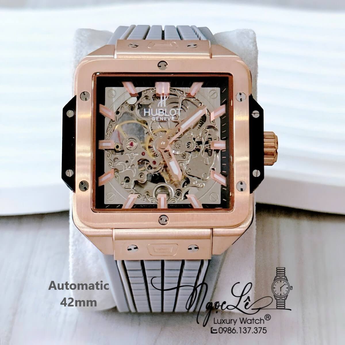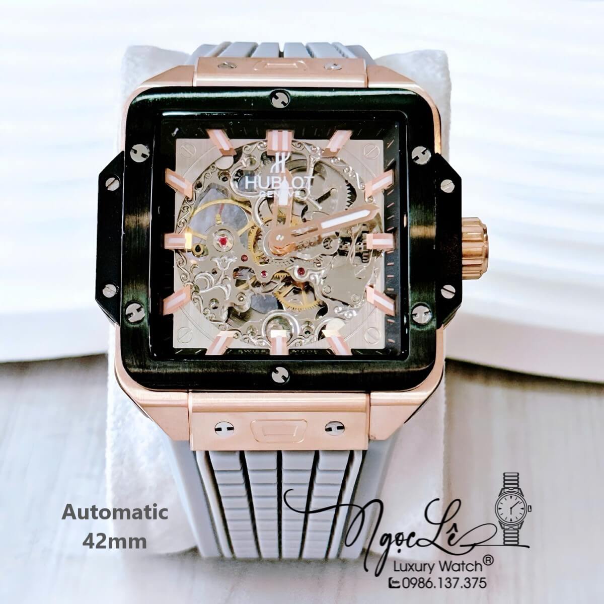 Đồng Hồ Nam Hublot Square Bang Máy Cơ Tự Động Dây Cao Su Xám Vỏ Rose Size 42mm
