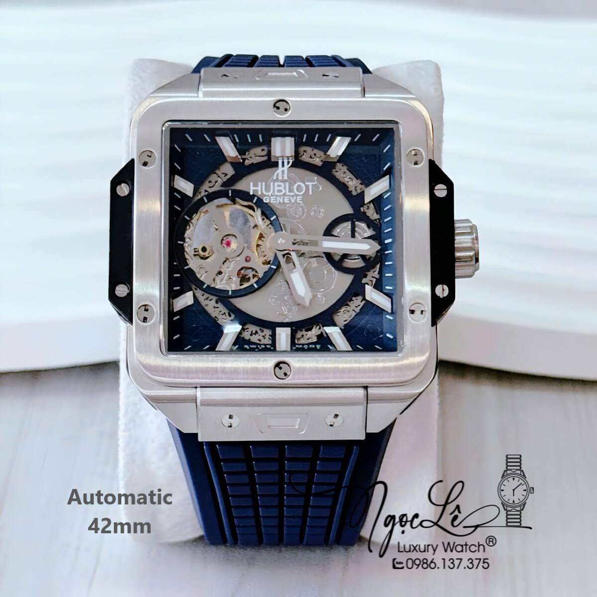 Đồng Hồ Nam Hublot Square Bang Máy Cơ Tự Động Dây Cao Su Xanh Navy Vỏ Silver Size 42mm