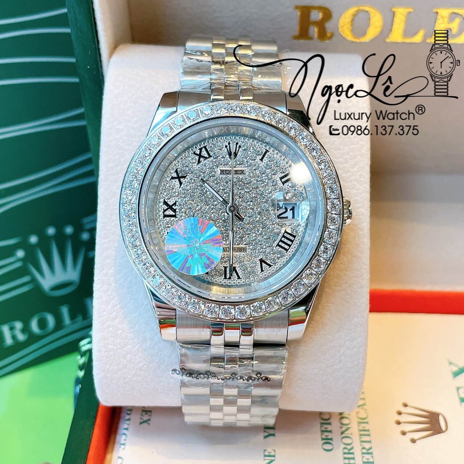Đồng Hồ Rolex Datejust Nam Màu Bạc Mặt Trắng Xà Cừ Đính Đá Cao Cấp Size 41mm Máy Pin