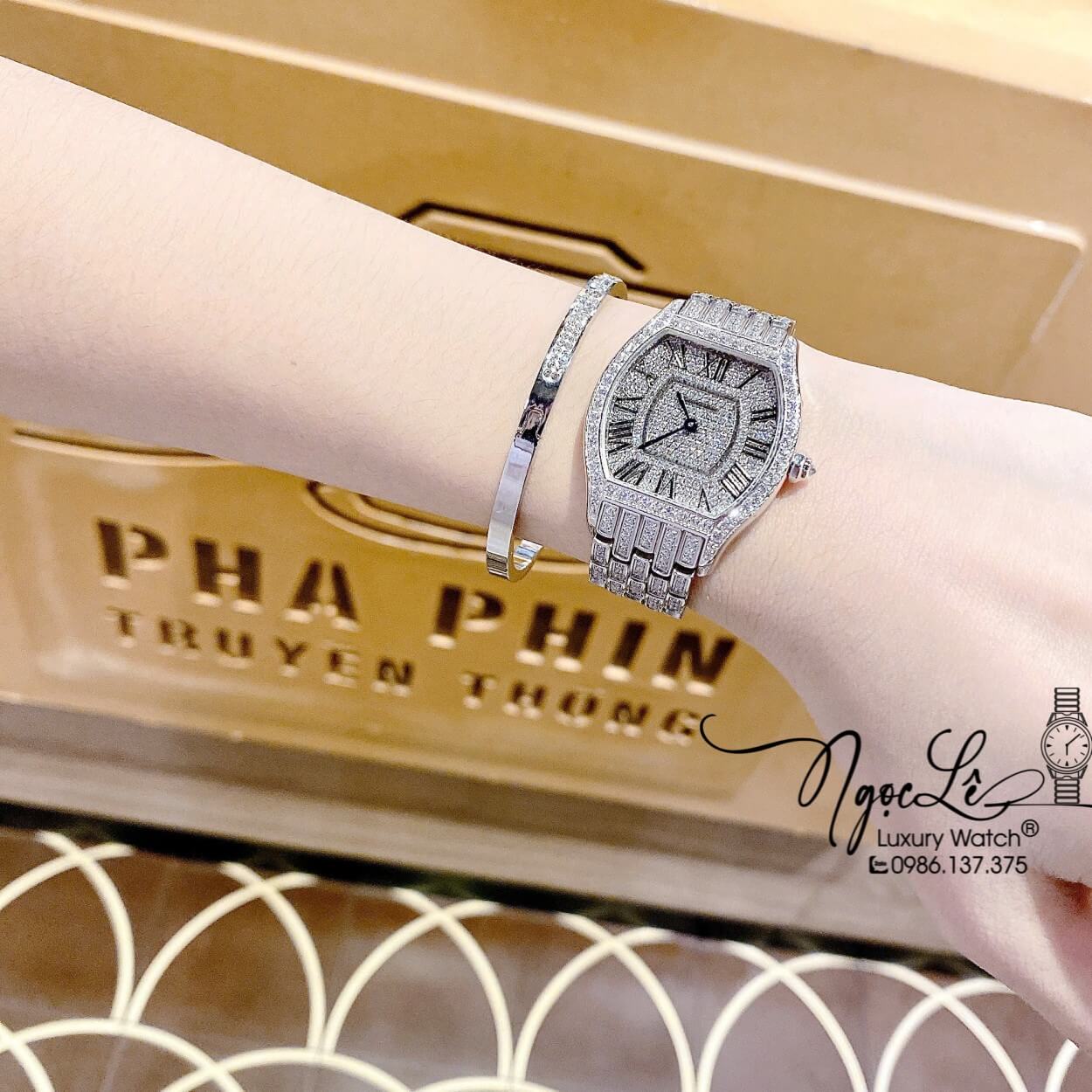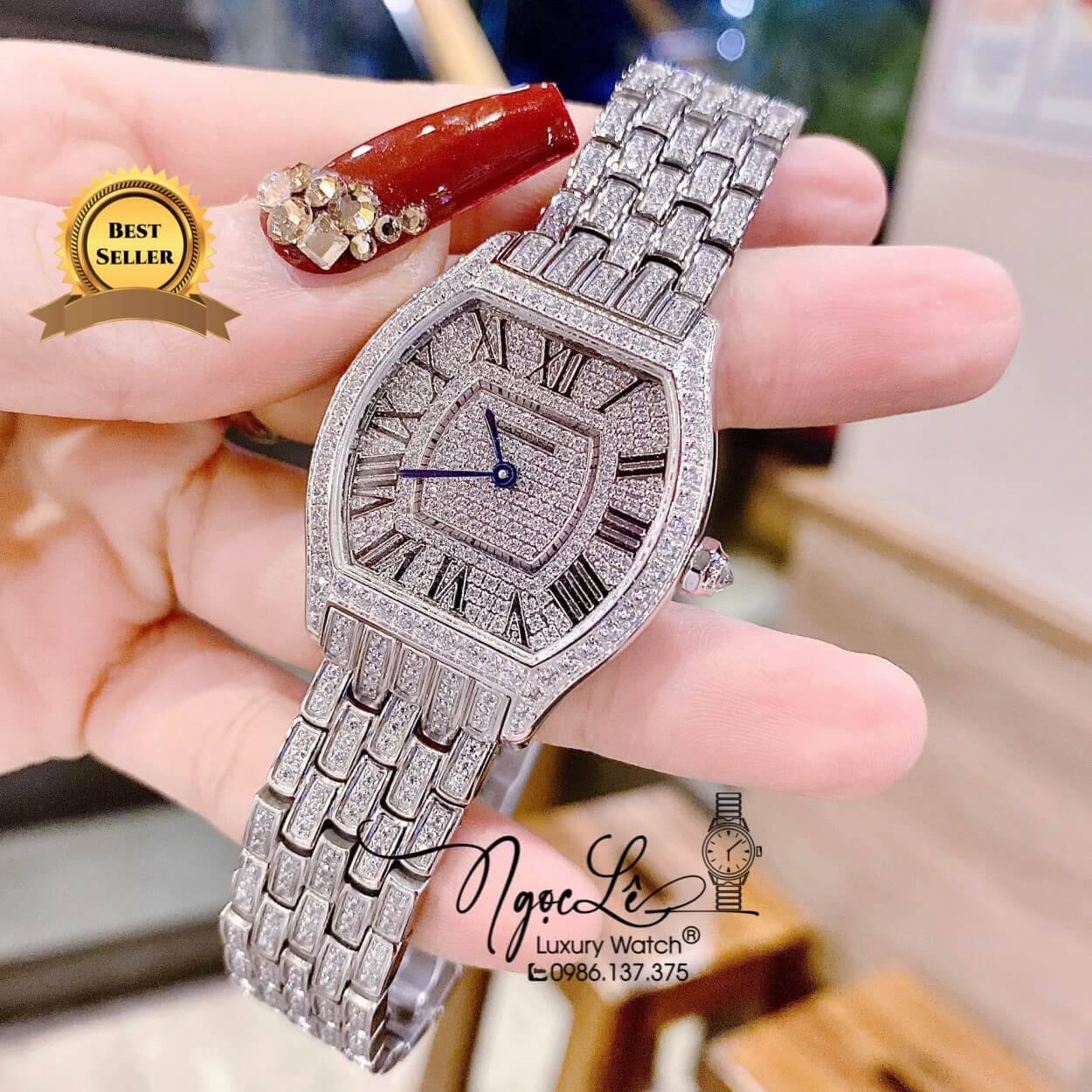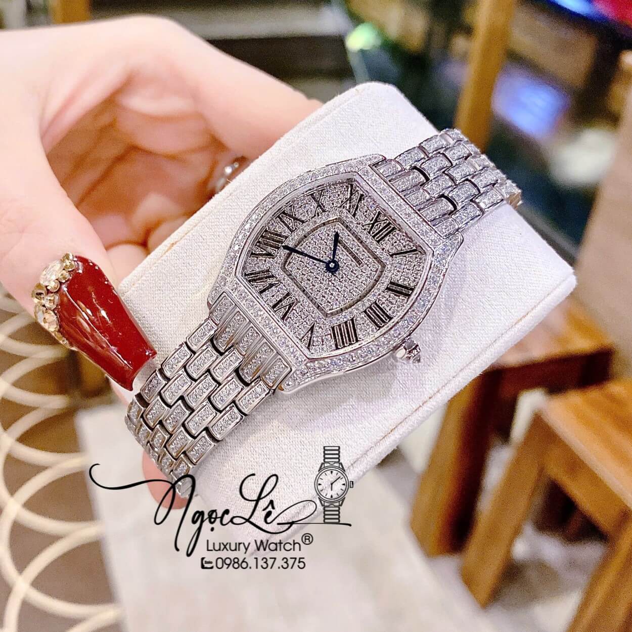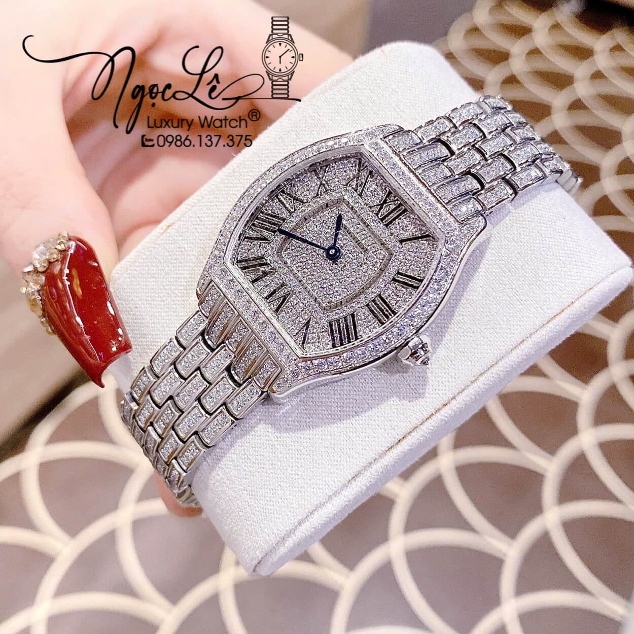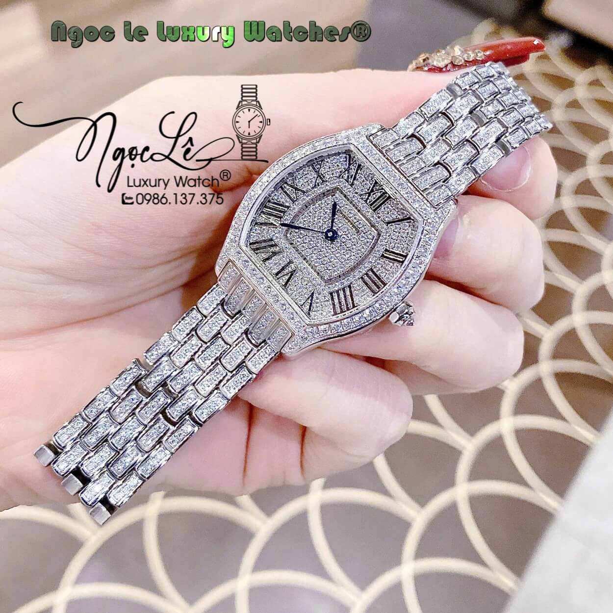 - Đồng hồ Cartier nữ mặt oval số la mã, máy Pin Thụy Sĩ siêu cấp đính full đá