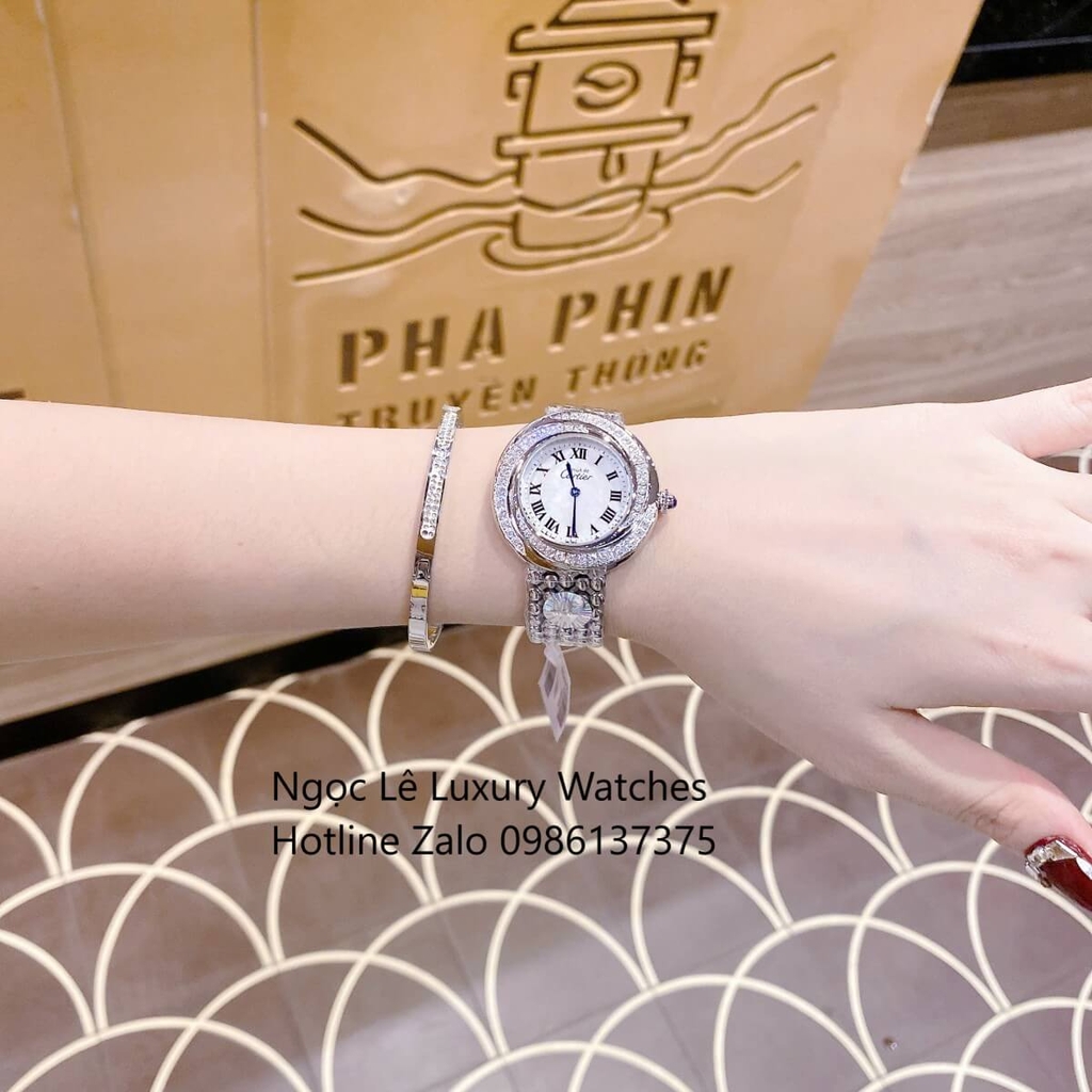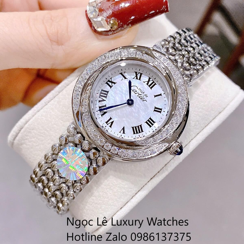 Đồng hồ Cartier nữ mặt tròn xà cừ số la mã, đồng hồ Cartier kim xanh siêu cấp nữ