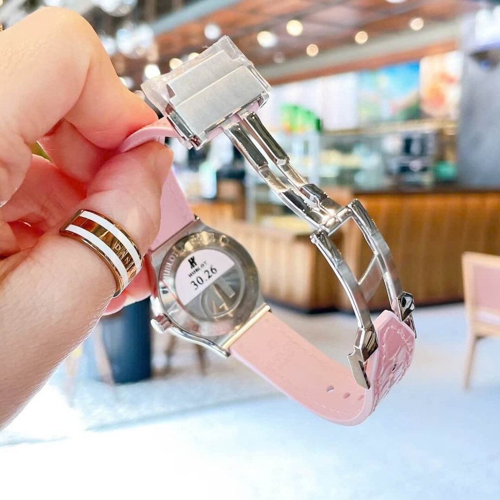 Đồng Hồ Nữ Hublot Classic Fusion Dây Cao Su Hồng Pastel Đính Đá Size 30mm – Máy Pin Miyota Nhật, Vỏ Silver