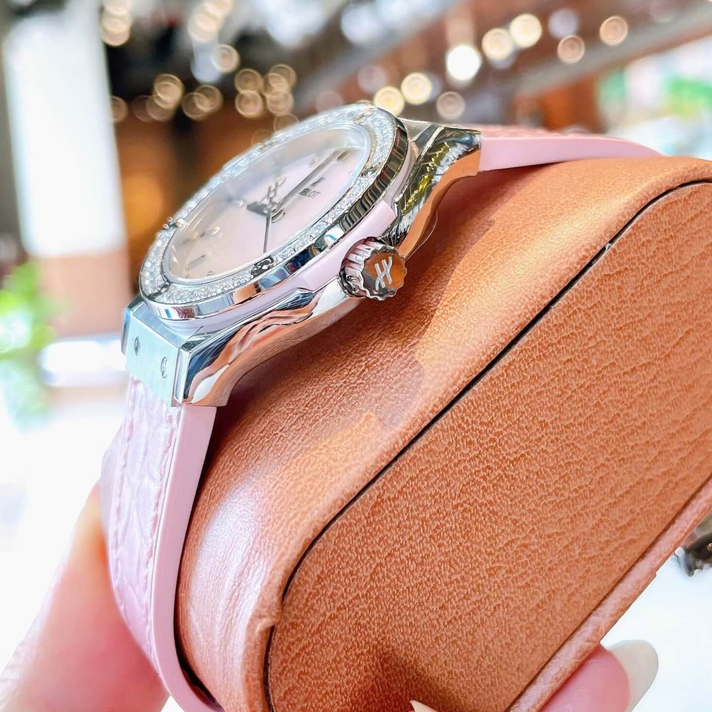 Đồng Hồ Nữ Hublot Classic Fusion Dây Cao Su Hồng Pastel Viền Đá Size 30mm – Máy Pin Miyota Nhật, Vỏ Silver