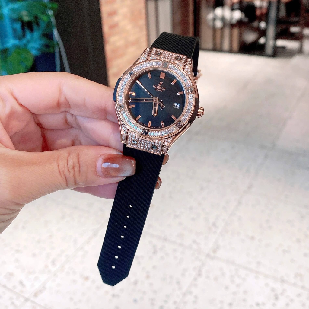 Đồng hồ Hublot nữ đính đá màu đen cao cấp, dây cao su bền bỉ chống nước