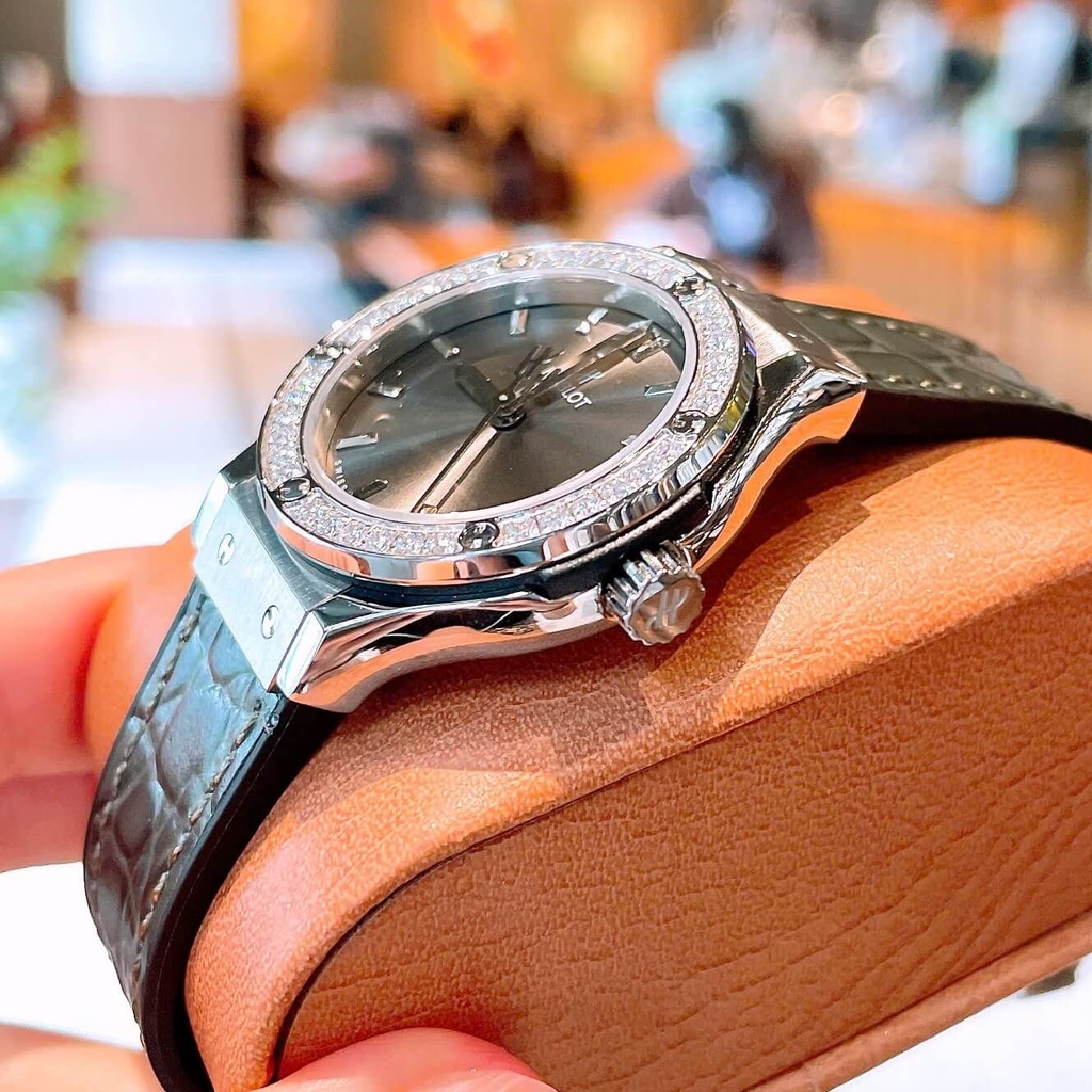 Đồng hồ Hublot nữ màu xám lông chuột viền đá size nhỏ, đồng hồ Hublot size 30mm cho nữ sang trọng