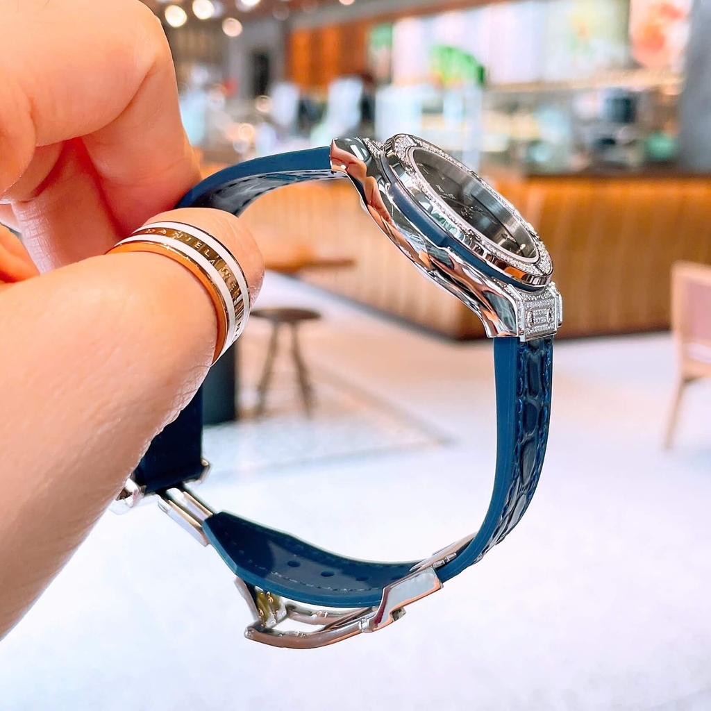 Đồng Hồ Nữ Hublot Classic Fusion Dây Cao Su Xanh Navy Viền Đính Đá Size 30mm Máy Pin Miyota Nhật - Vỏ Silver