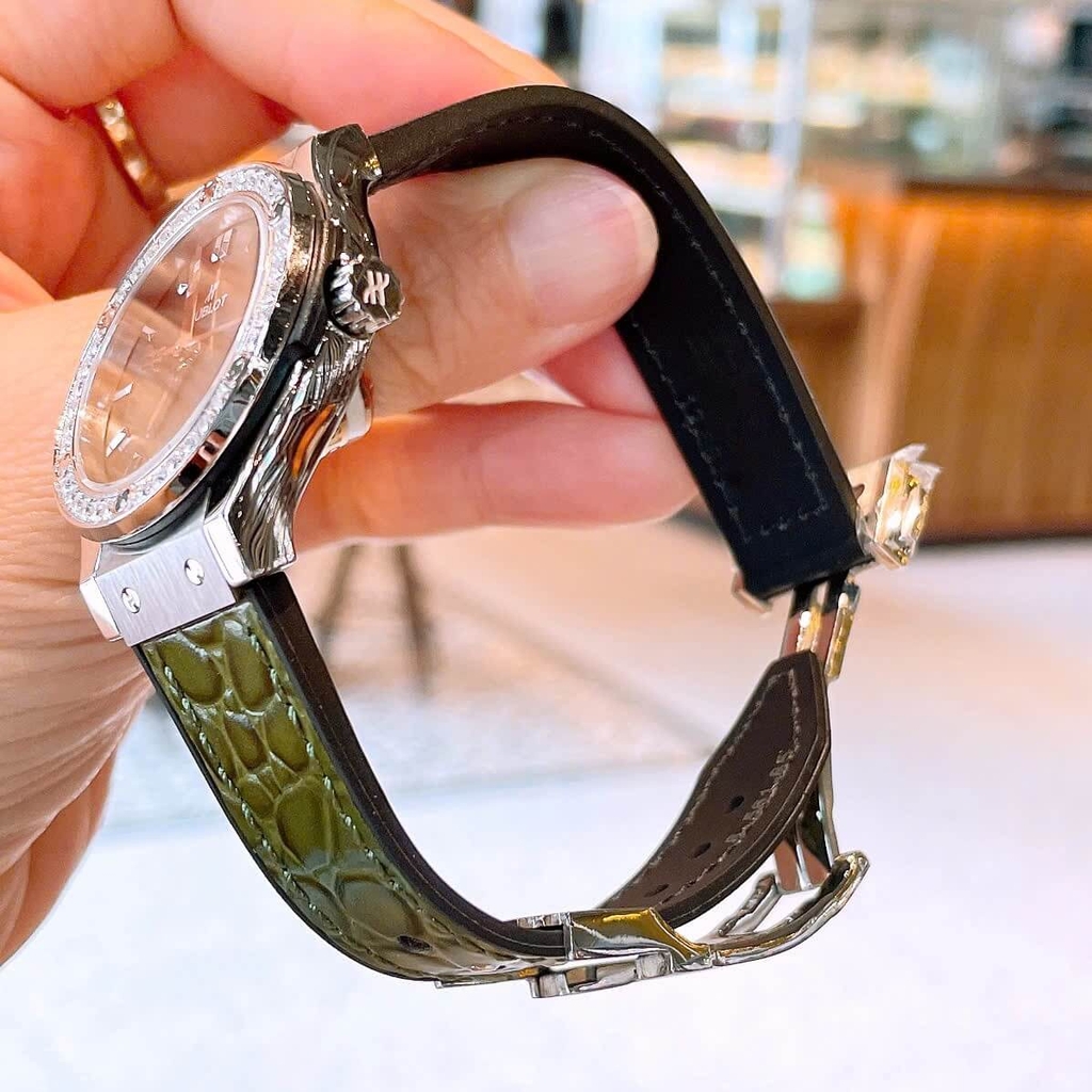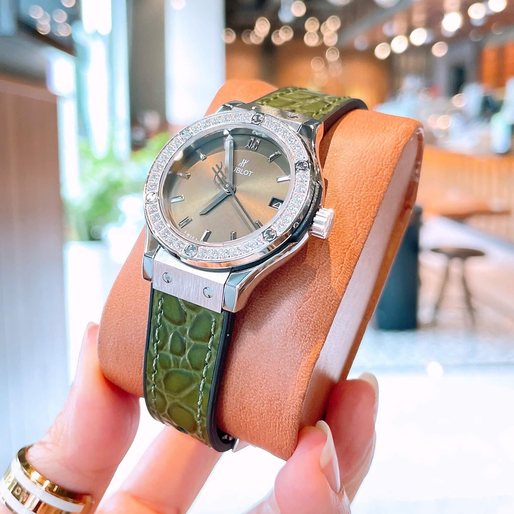 Đồng hồ Hublot nữ màu xanh rêu viền đá size nhỏ, đồng hồ Hublot size 30mm cho nữ sang trọng