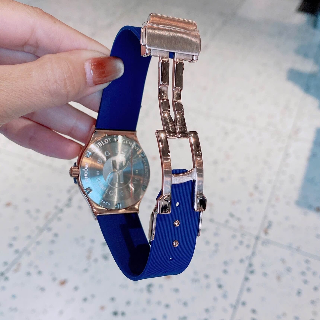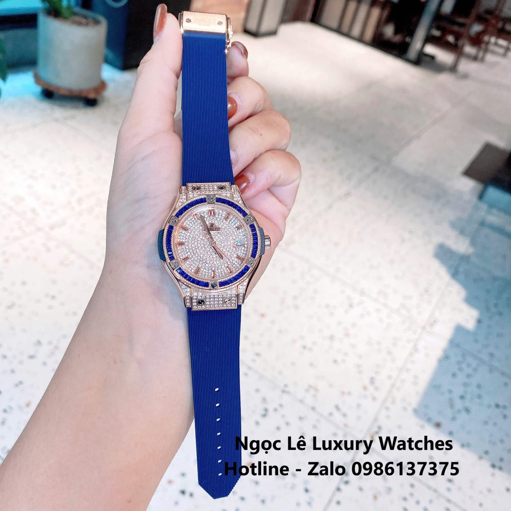 Đồng Hồ Nữ Hublot Classic Fusion Dây Cao Su Màu Xanh Vỏ Rose Viền Đá Size 34mm - Máy Quartz