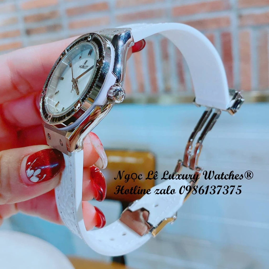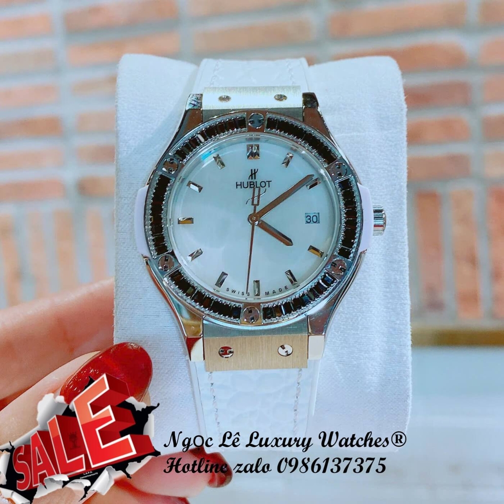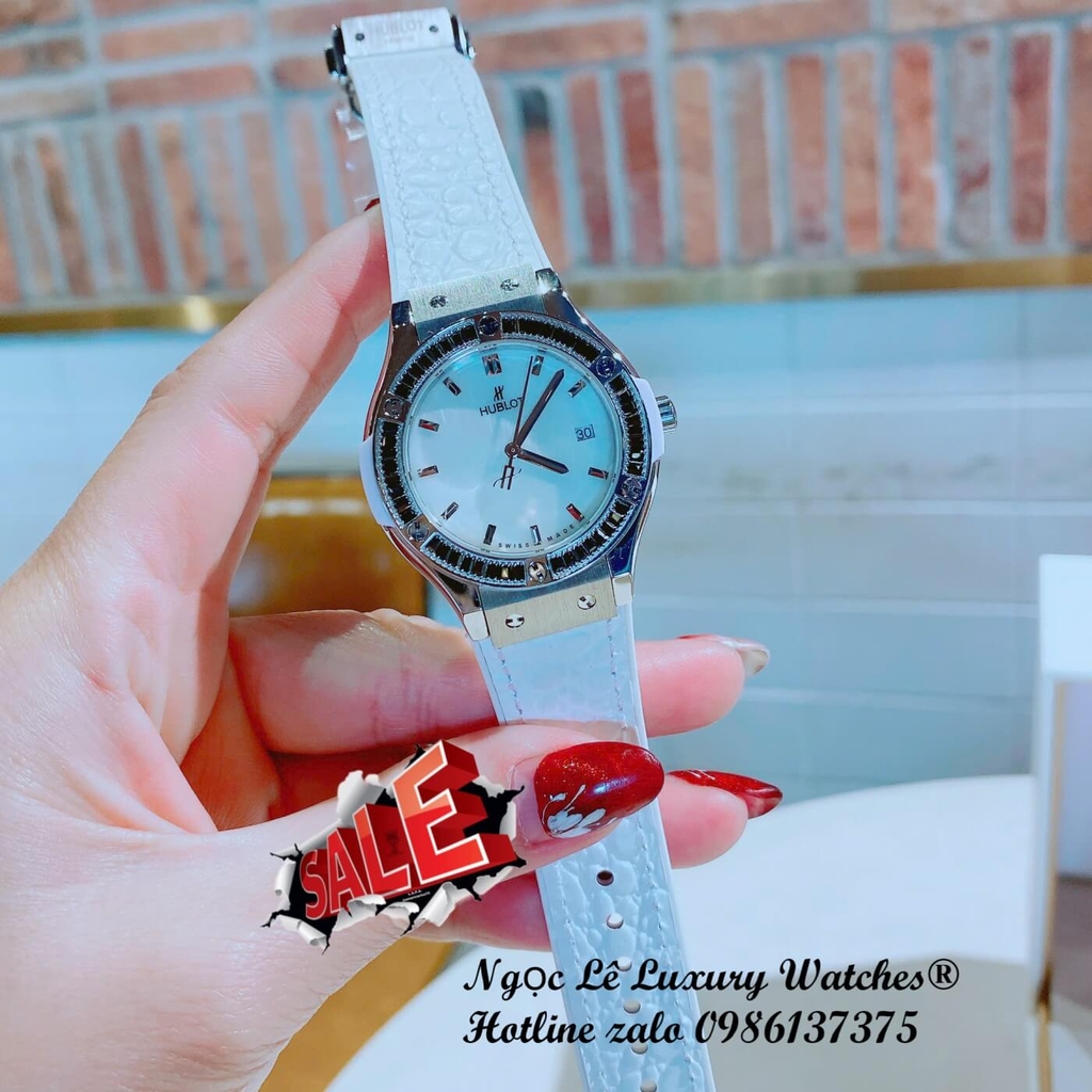 Đồng hồ Hublot Classic Fusion dây da trắng viền đá đen cho nữ, vỏ thép silver size 34mm, mẫu đồng hồ mang phong cách thanh lịch, hiện đại và đầy tinh tế.