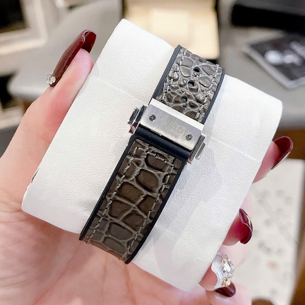 Đồng hồ nữ Hublot Classic Fusion dây da xám viền đá silver size 34mm là mẫu đồng hồ mang phong cách thanh lịch, hiện đại và đầy tinh tế. Sự kết hợp giữa tone xám nhẹ nhàng cùng viền đính đá lấp lánh giúp tạo nên vẻ ngoài sang trọng nhưng vẫn rất dễ đeo hằng ngày.
