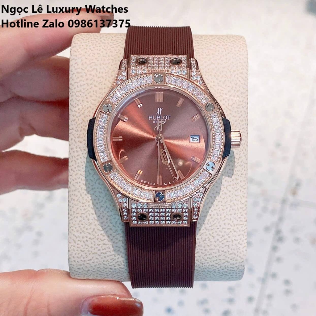 Đồng hồ Hublot nữ màu nâu socola đính đá vàng hồng, đồng hồ Hublot đính đá sang trọng, trẻ trung