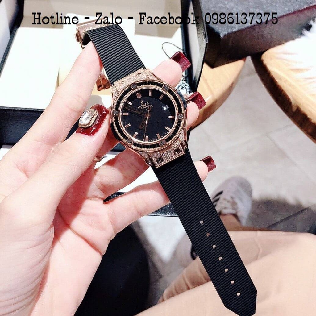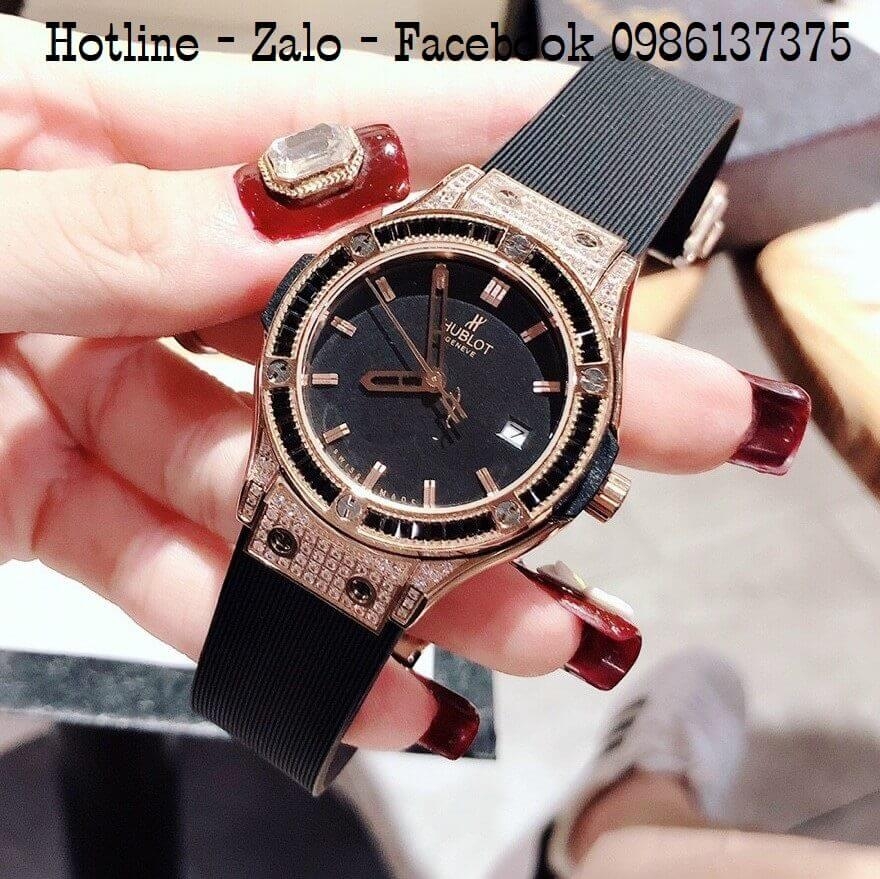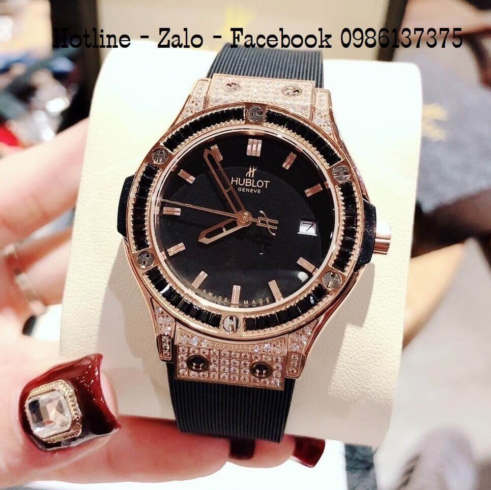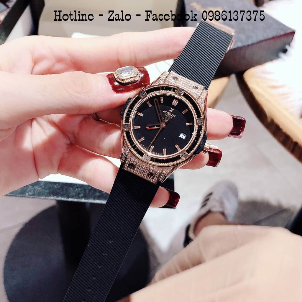 Đồng hồ nữ Hublot Classic Fusion dây cao su đen viền đá đen size 34mm vỏ rose gold, kính sapphire chống trầy, vỏ thép không gỉ, khóa mỏ vịt cao cấp, thiết kế sang trọng, chống nước sinh hoạt.