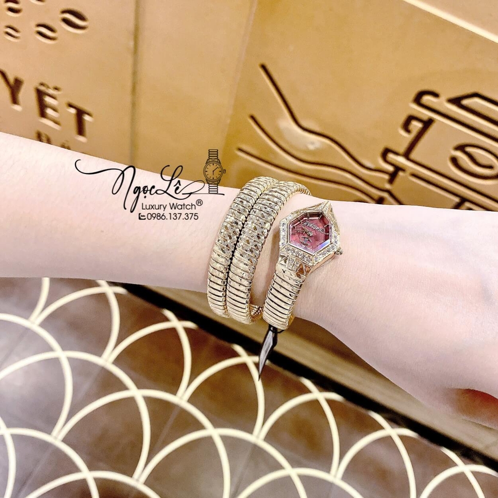 Hình ảnh thực tế Đồng Hồ Nữ Just Cavalli Rắn Quấn Vòng Màu Vàng Gold Mặt Đỏ Lì Size 23mm