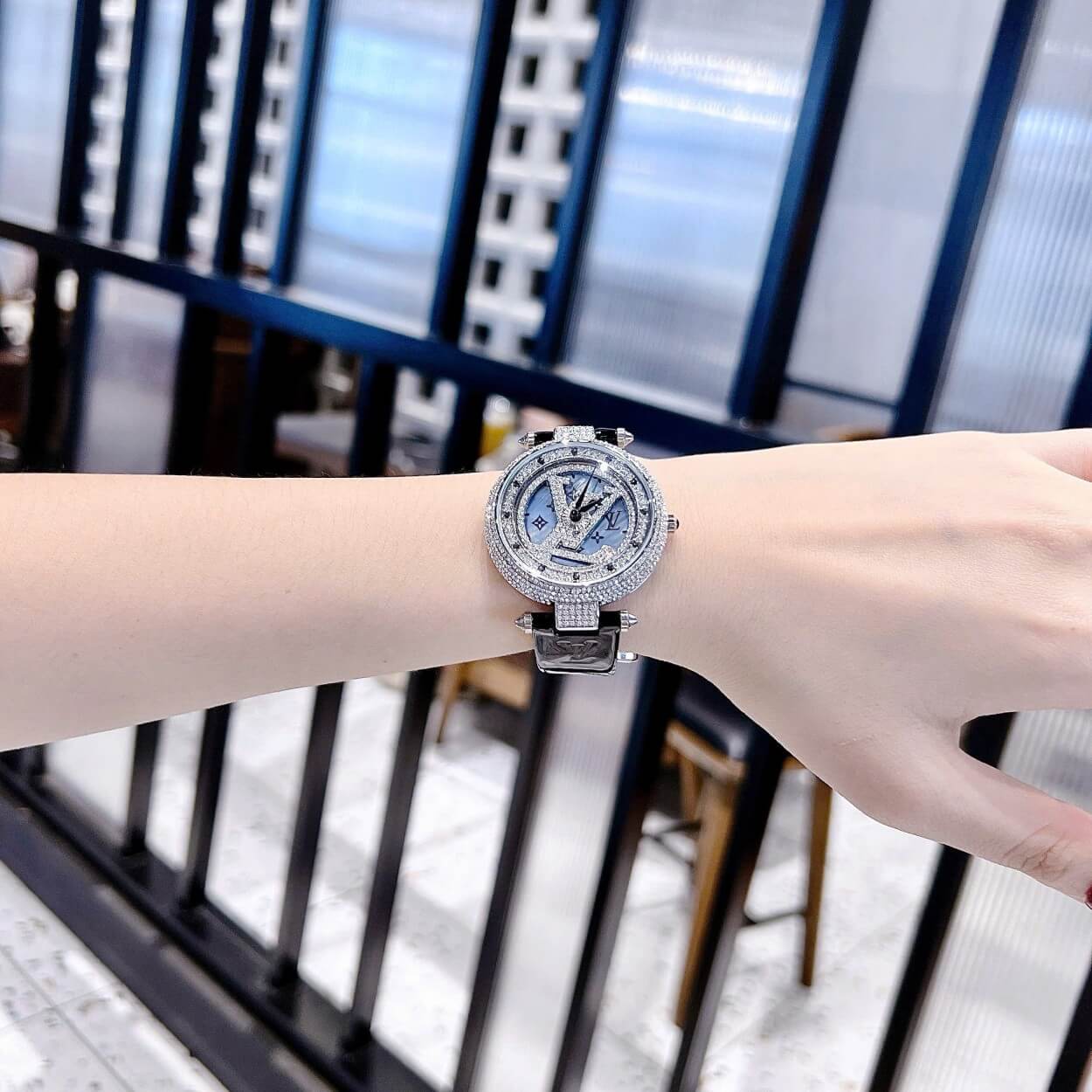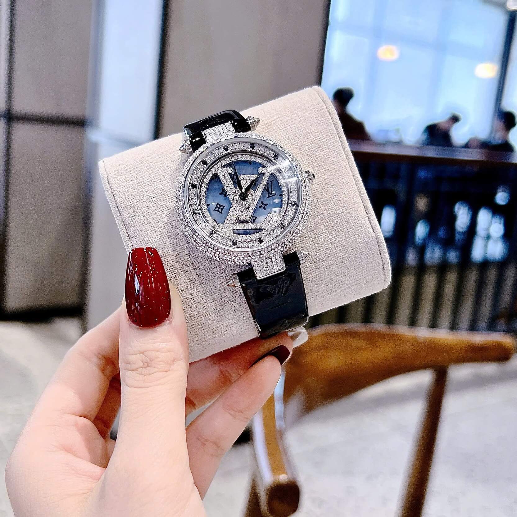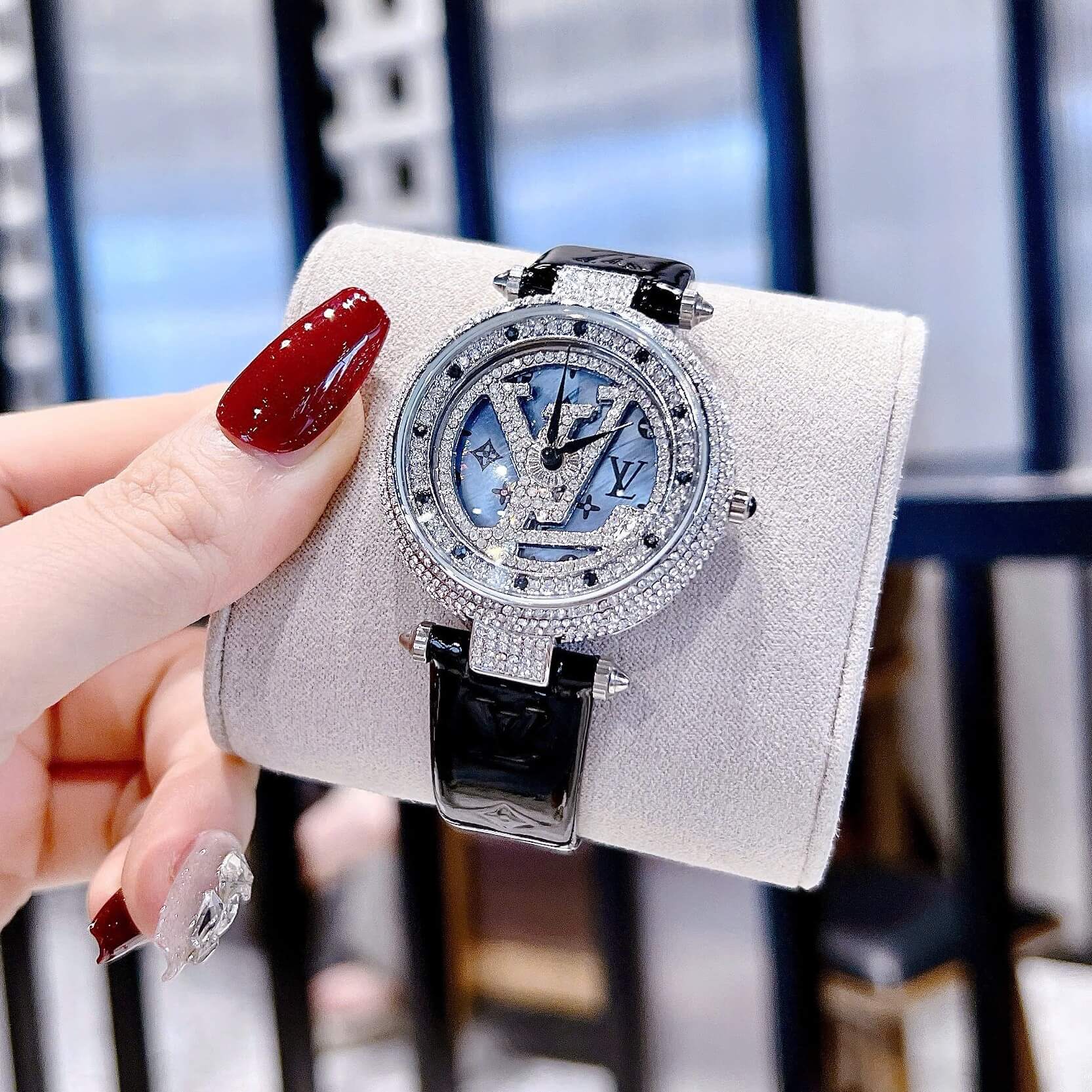 Đồng Hồ Nữ Louis Vuitton Dây Da Đen Bóng Logo Mặt LV Xoay Đính Đá Size 38mm - Vỏ Silver