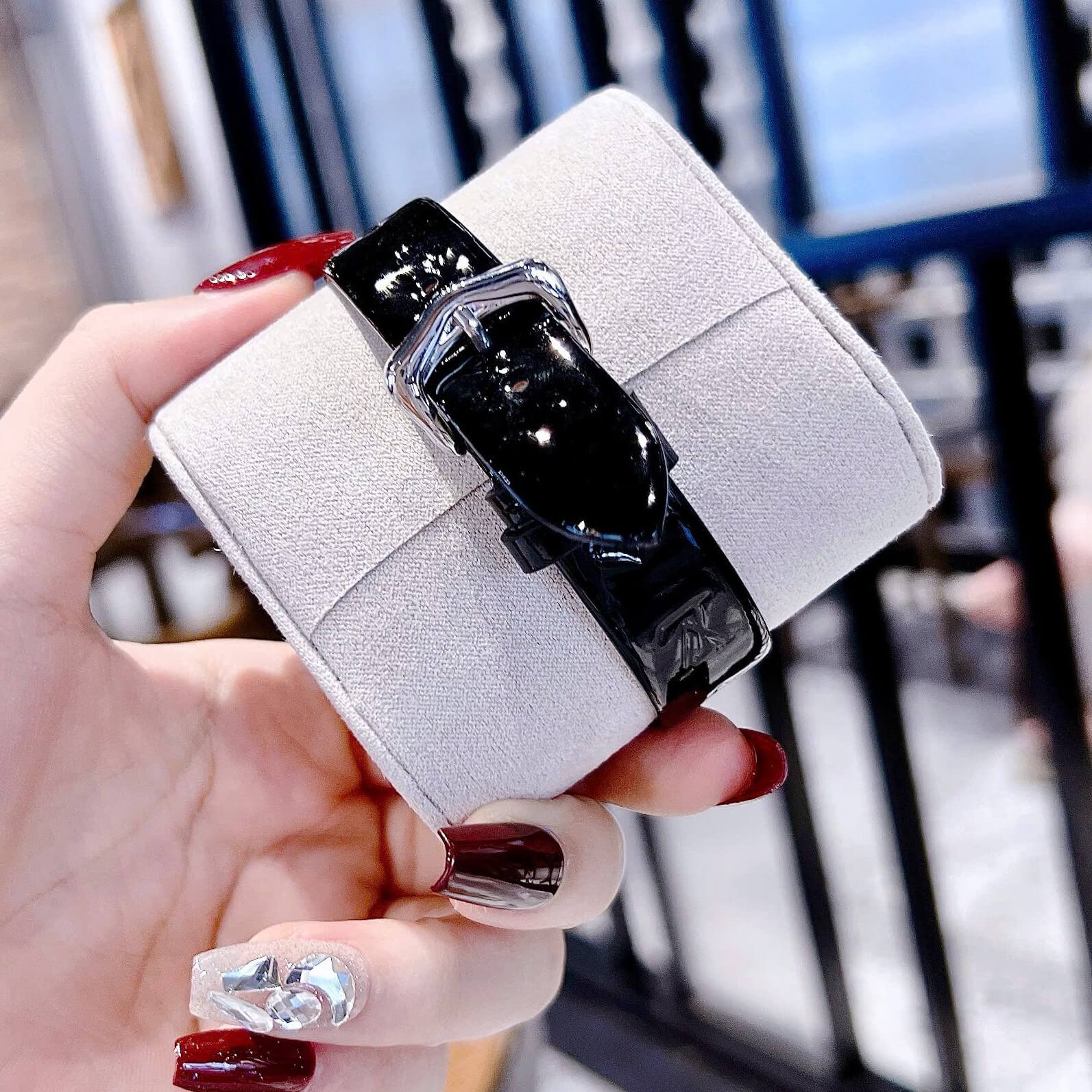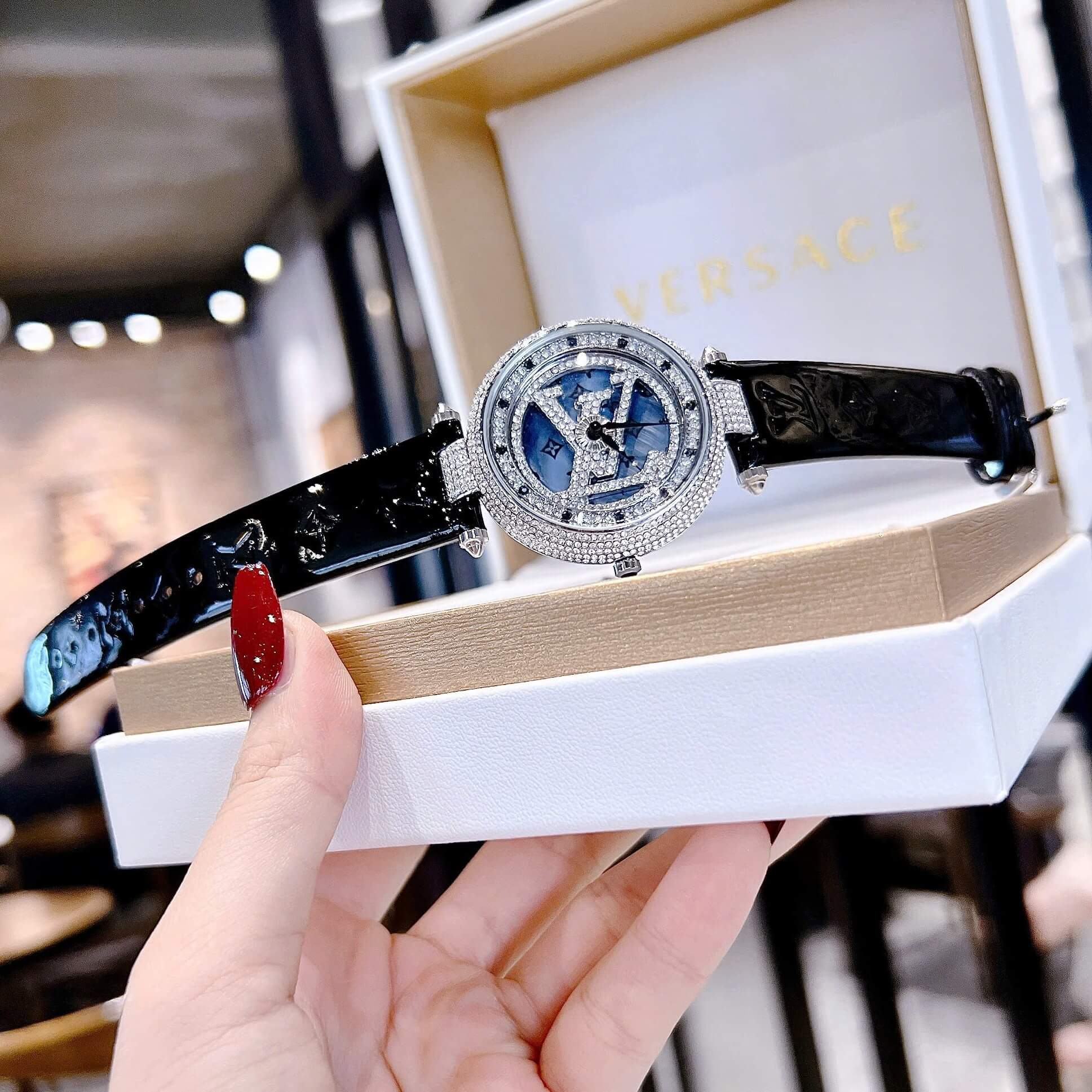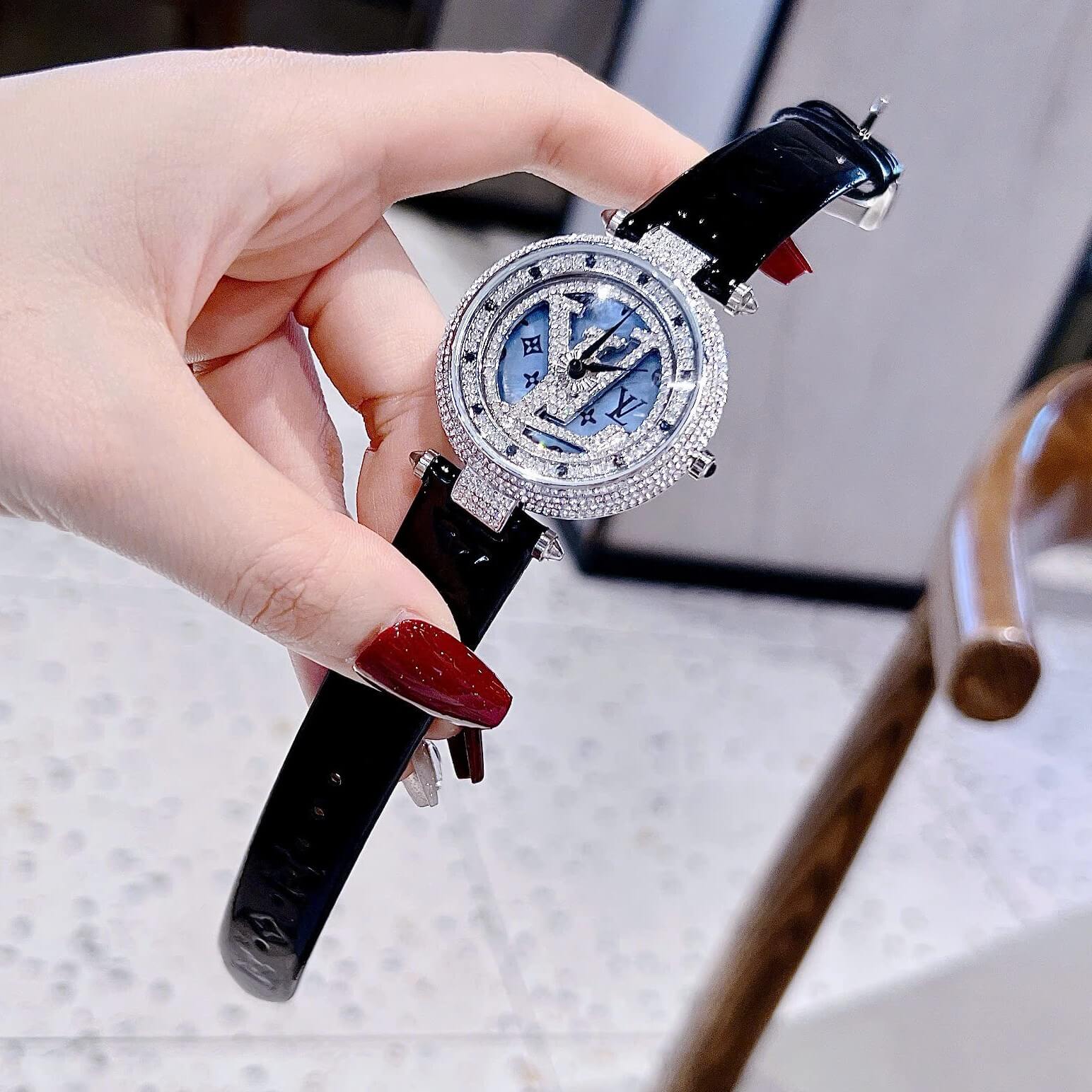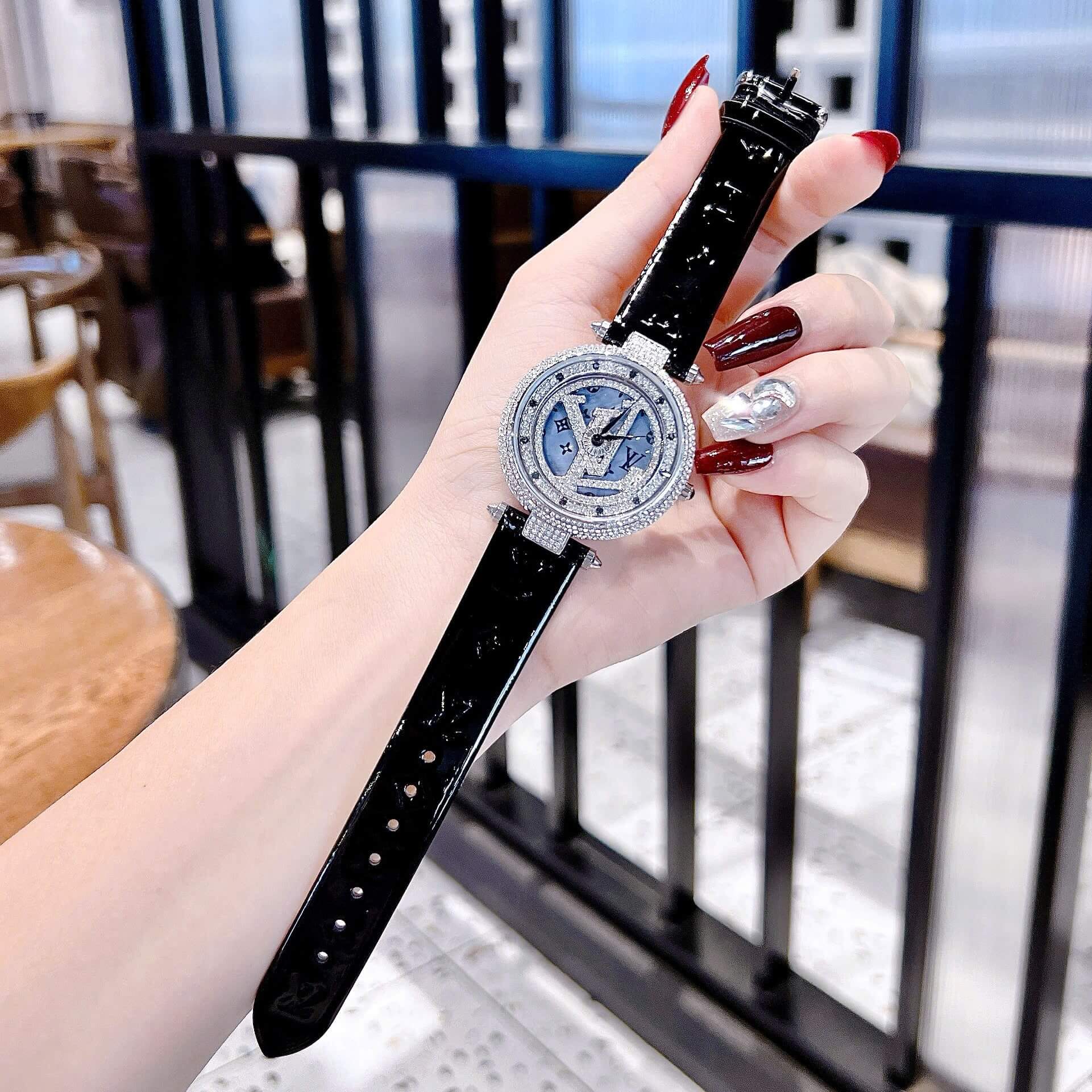 Đồng Hồ Nữ Louis Vuitton Dây Da Đen Bóng Logo Mặt LV Xoay Đính Đá Size 38mm - Vỏ Silver