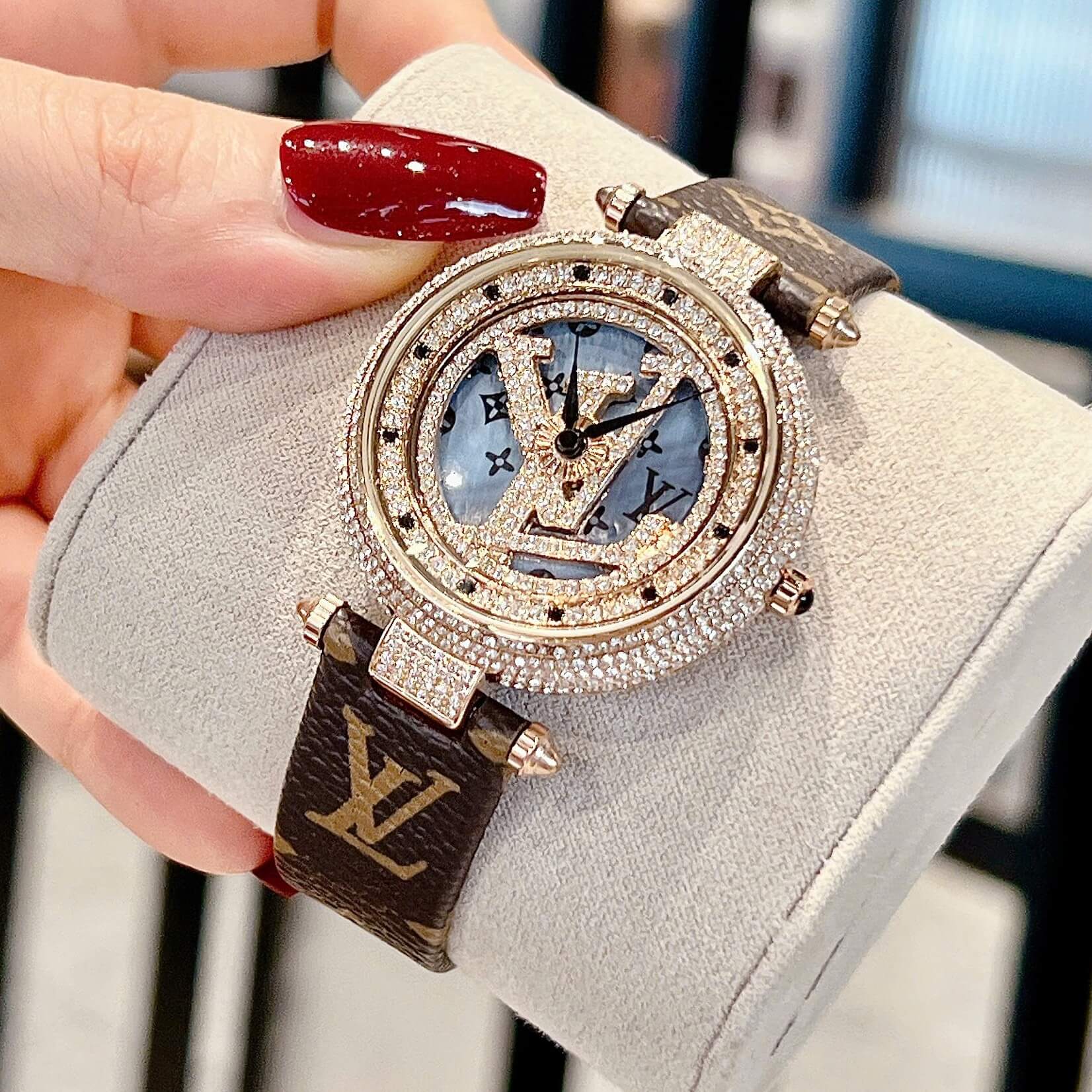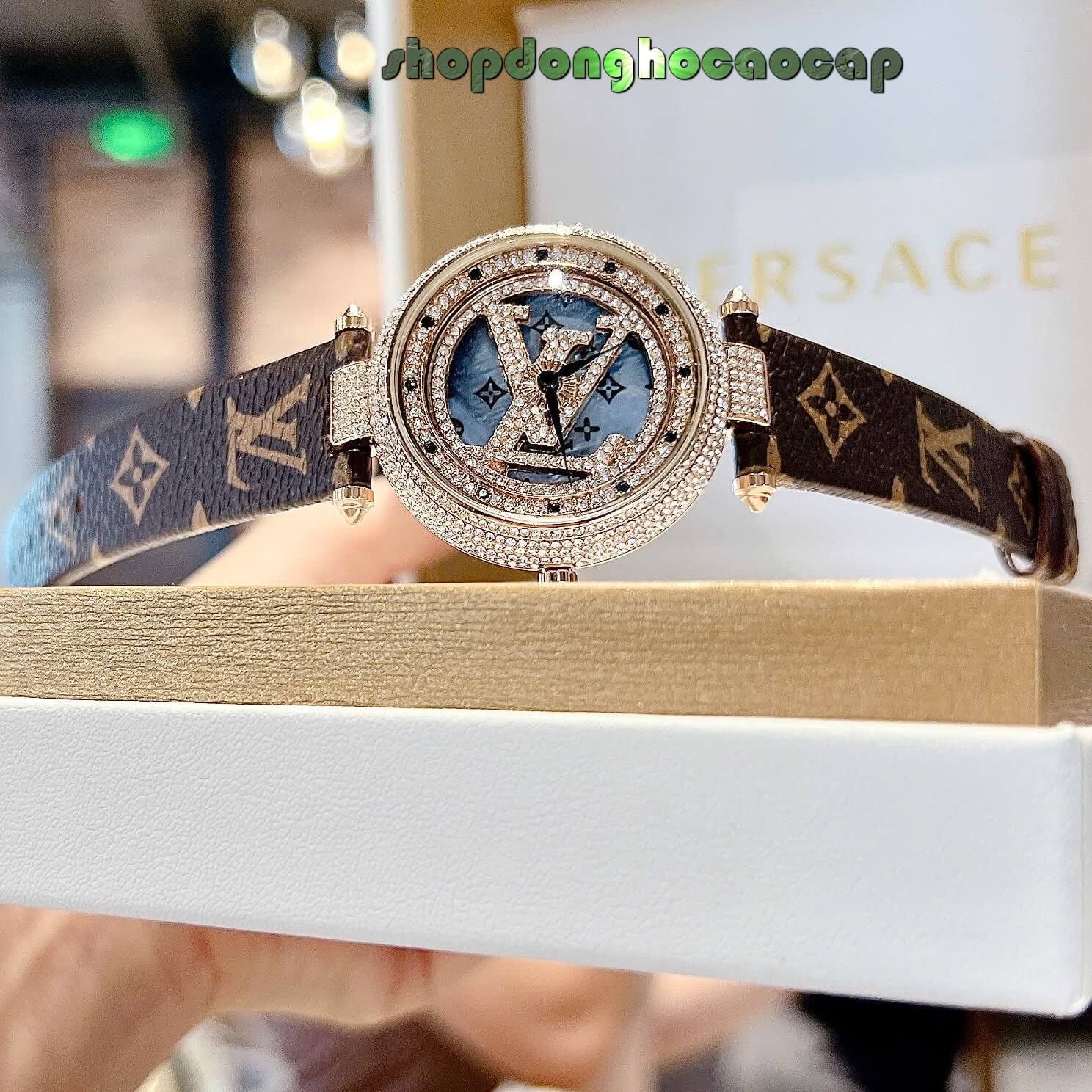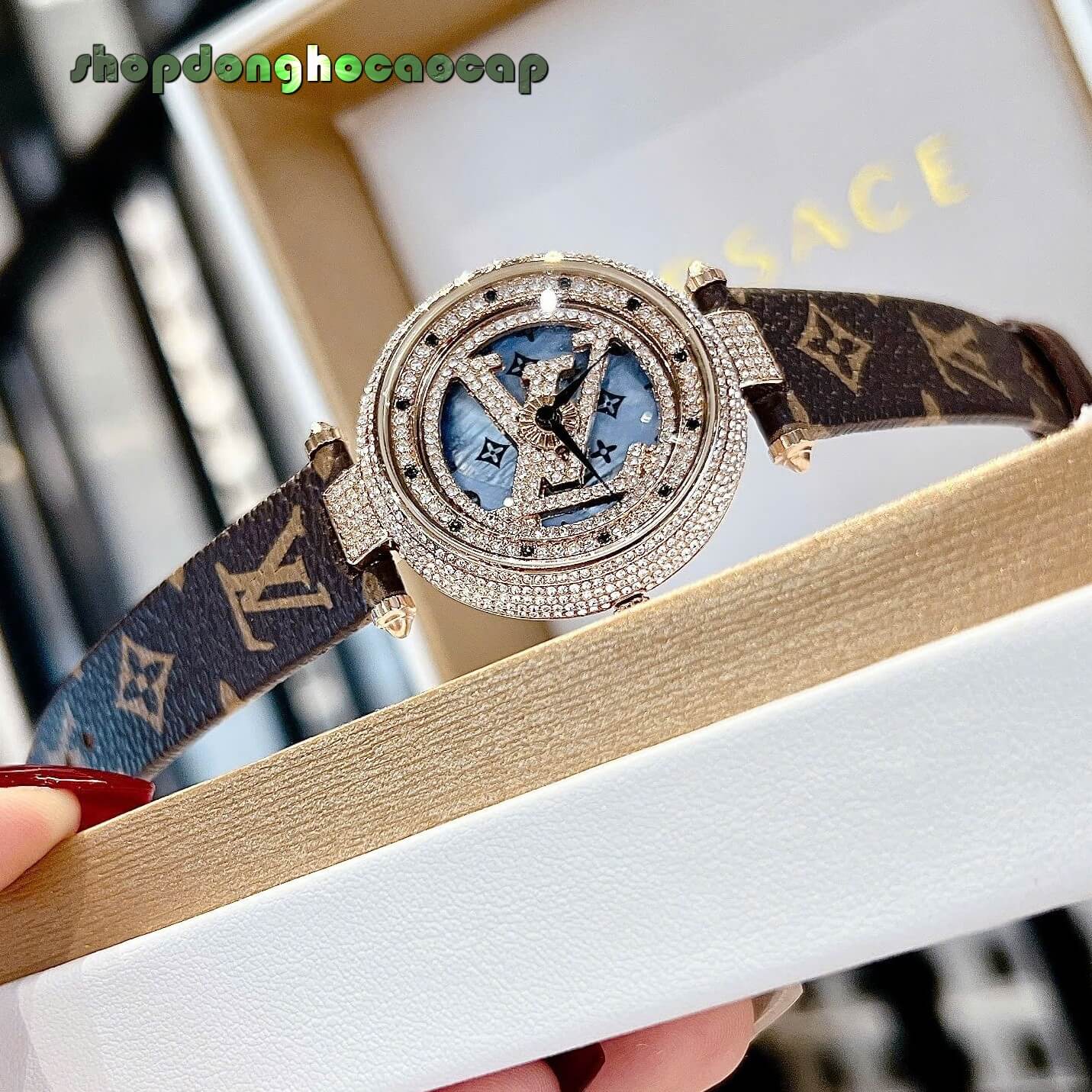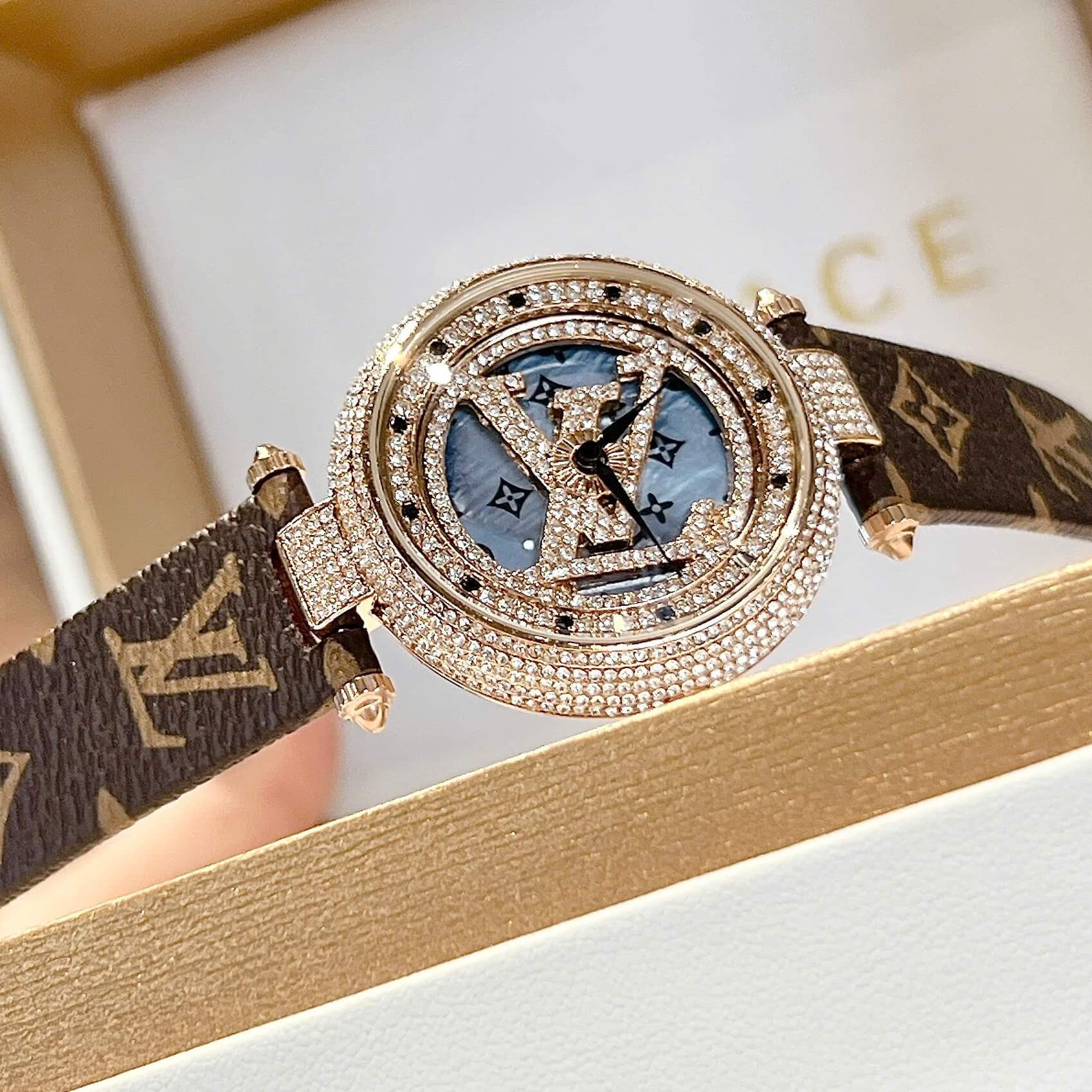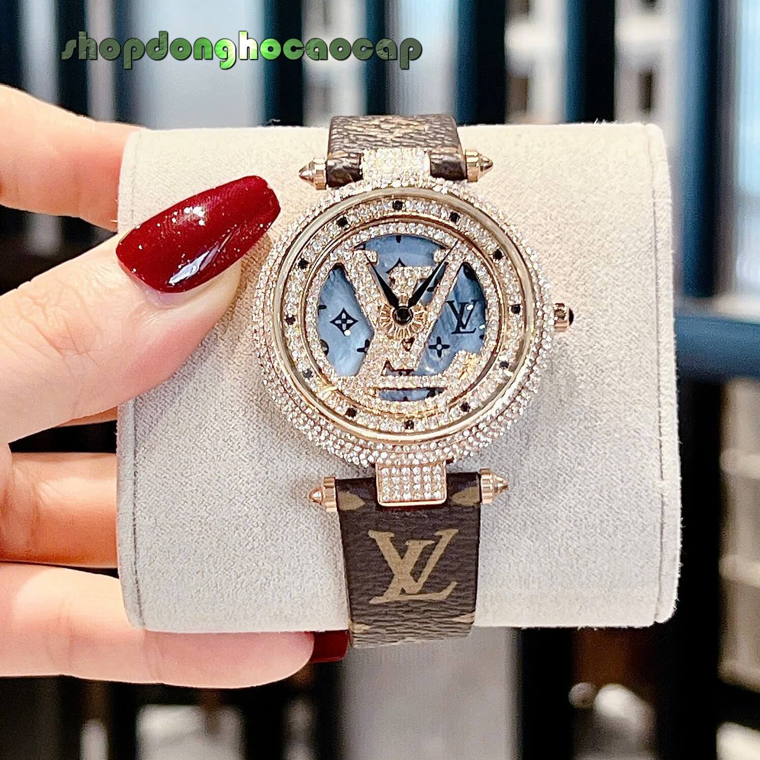 Đồng Hồ Nữ Louis Vuitton Dây Da Nâu Logo Mặt LV Xoay Đính Đá Size 38mm - Vỏ Rose