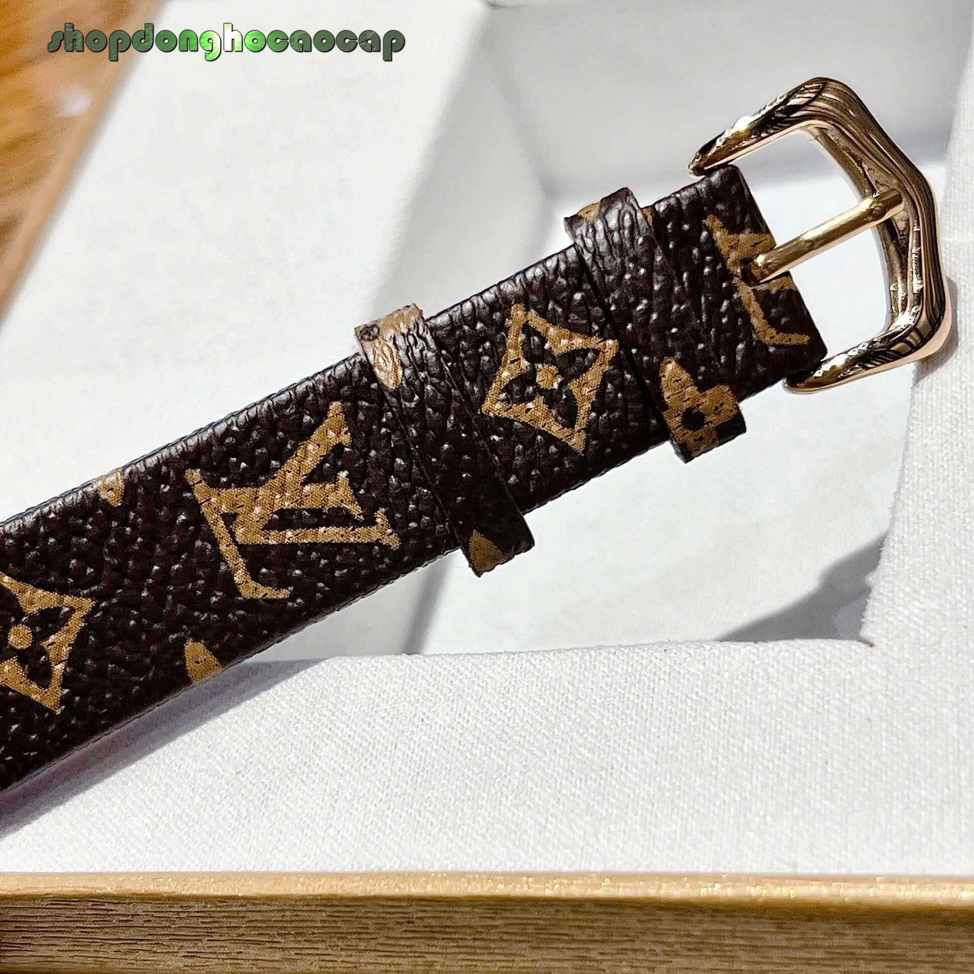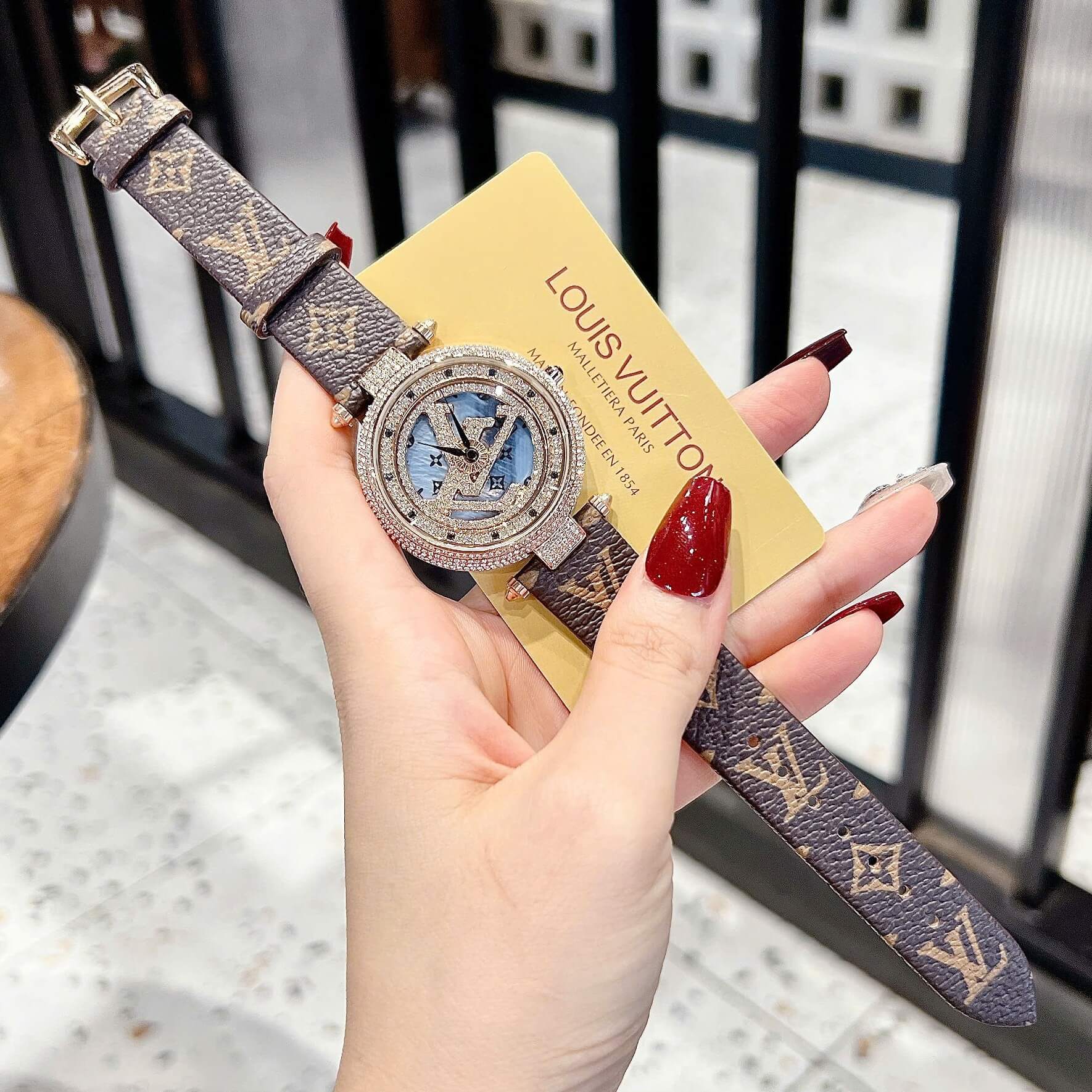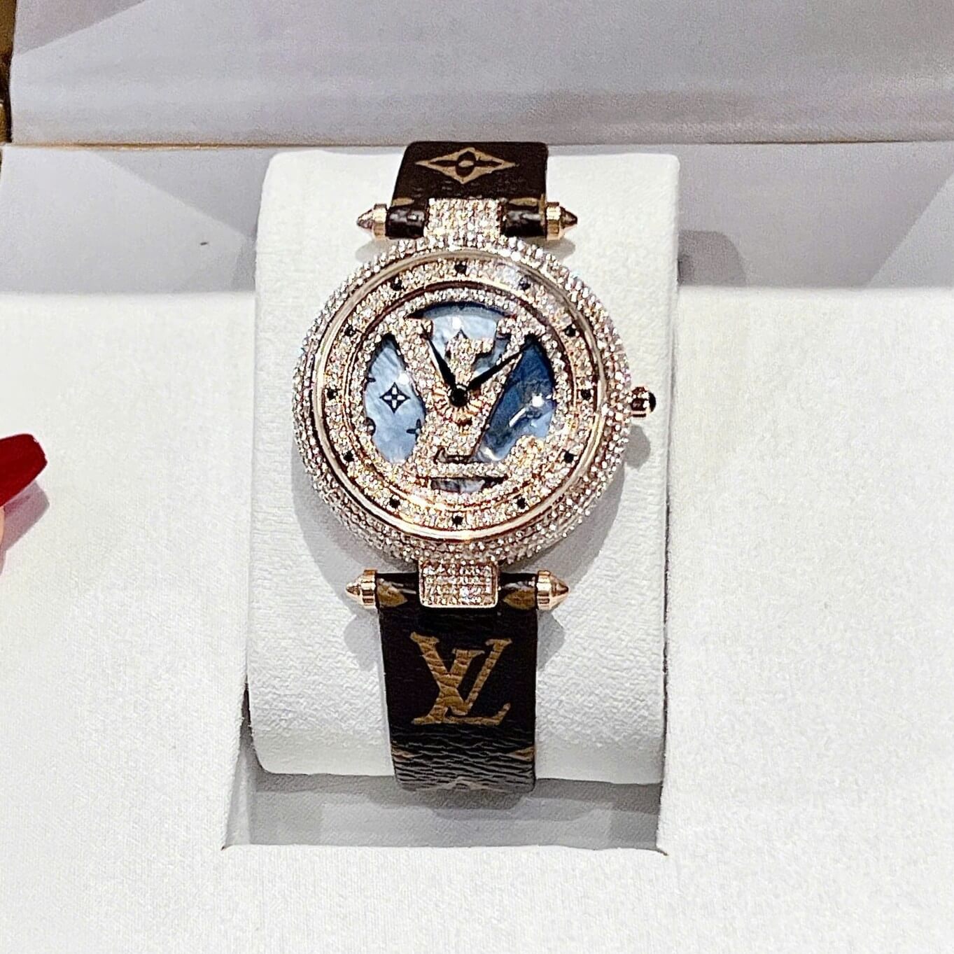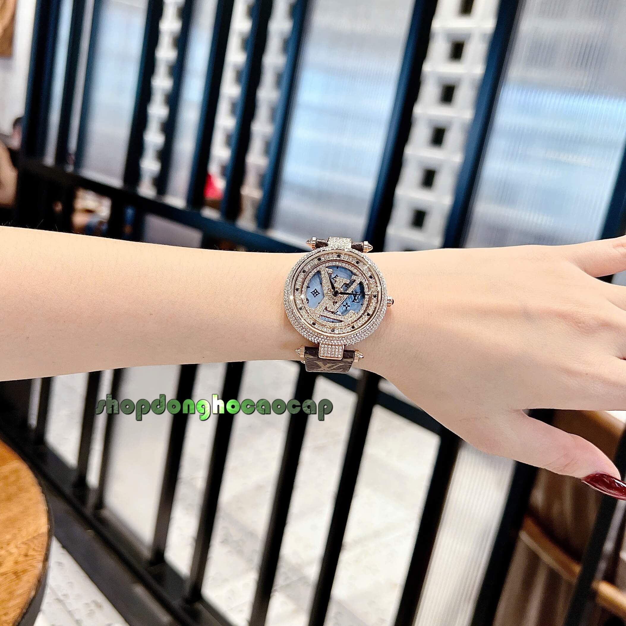 Hình ảnh Đồng Hồ Nữ Louis Vuitton Dây Da Nâu Logo Mặt LV Xoay Đính Đá Size 38mm - Vỏ Rose