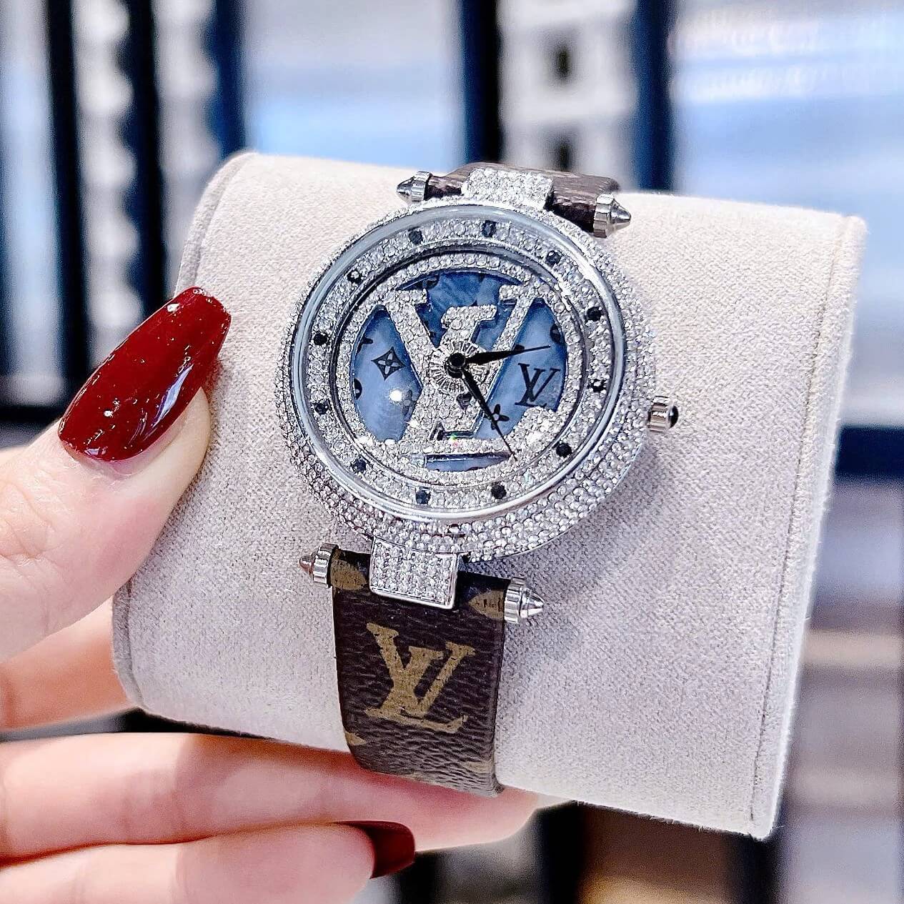 Đồng Hồ Nữ Louis Vuitton Dây Da Nâu Logo Mặt LV Xoay Đính Đá Size 38mm - Vỏ Silver