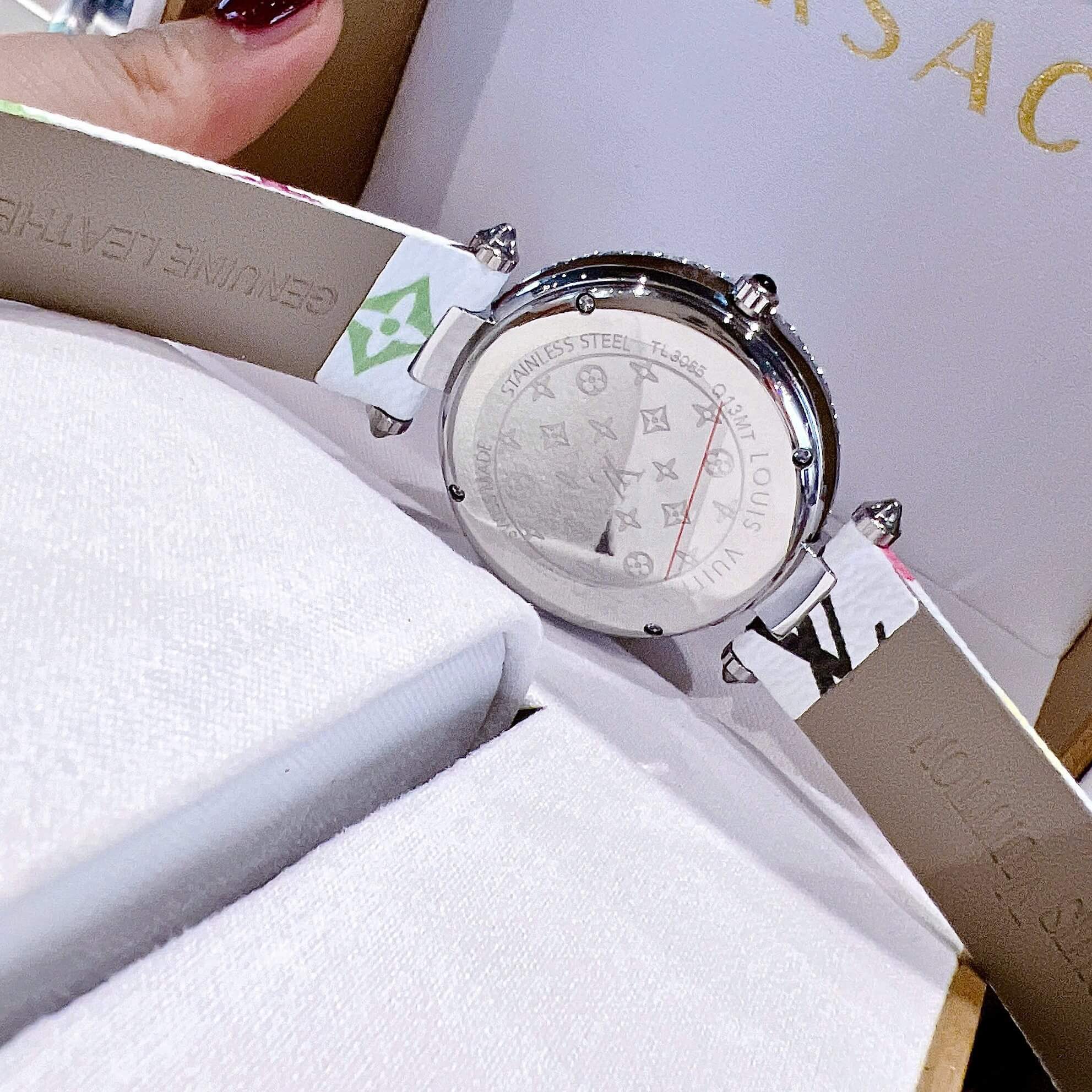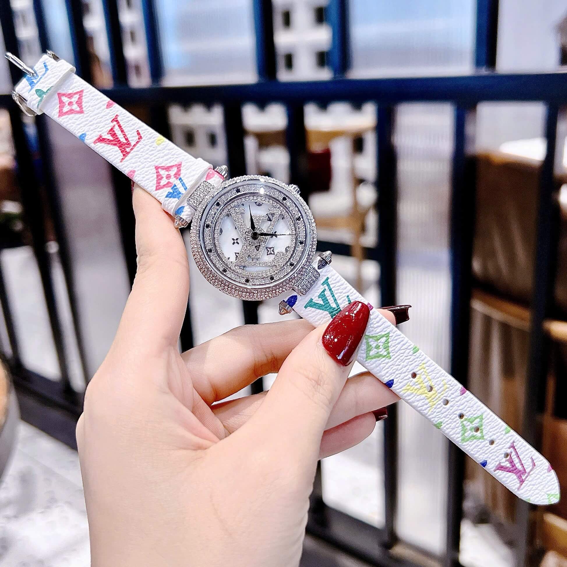 Mẫu đồng hồ nữ Louis Vuitton phiên bản dây da trắng mang phong cách thanh lịch và sang trọng. Mặt xà cừ trắng phối viền đính đá cùng chi tiết LV xoay độc đáo giúp thiết kế trở nên tinh tế, phù hợp cho cả đi làm, dạo phố hay dự tiệc.