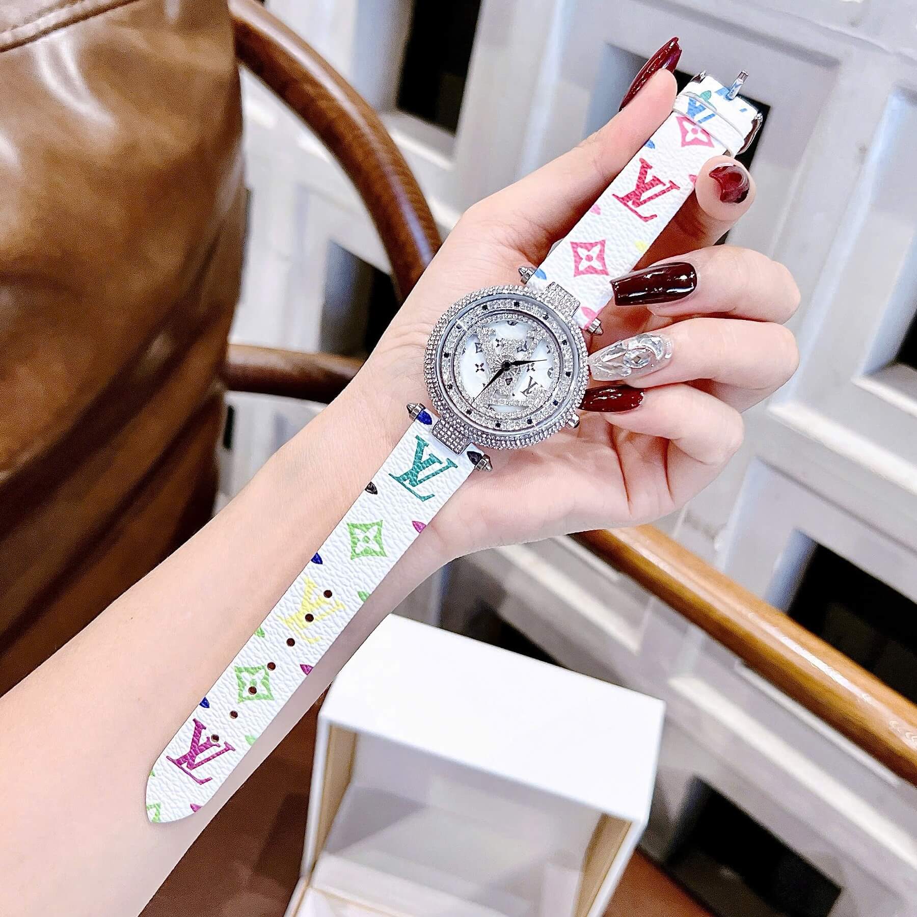 Đồng Hồ Nữ Louis Vuitton Dây Da Trắng Logo Mặt LV Xoay Đính Đá Size 38mm - Vỏ Silver