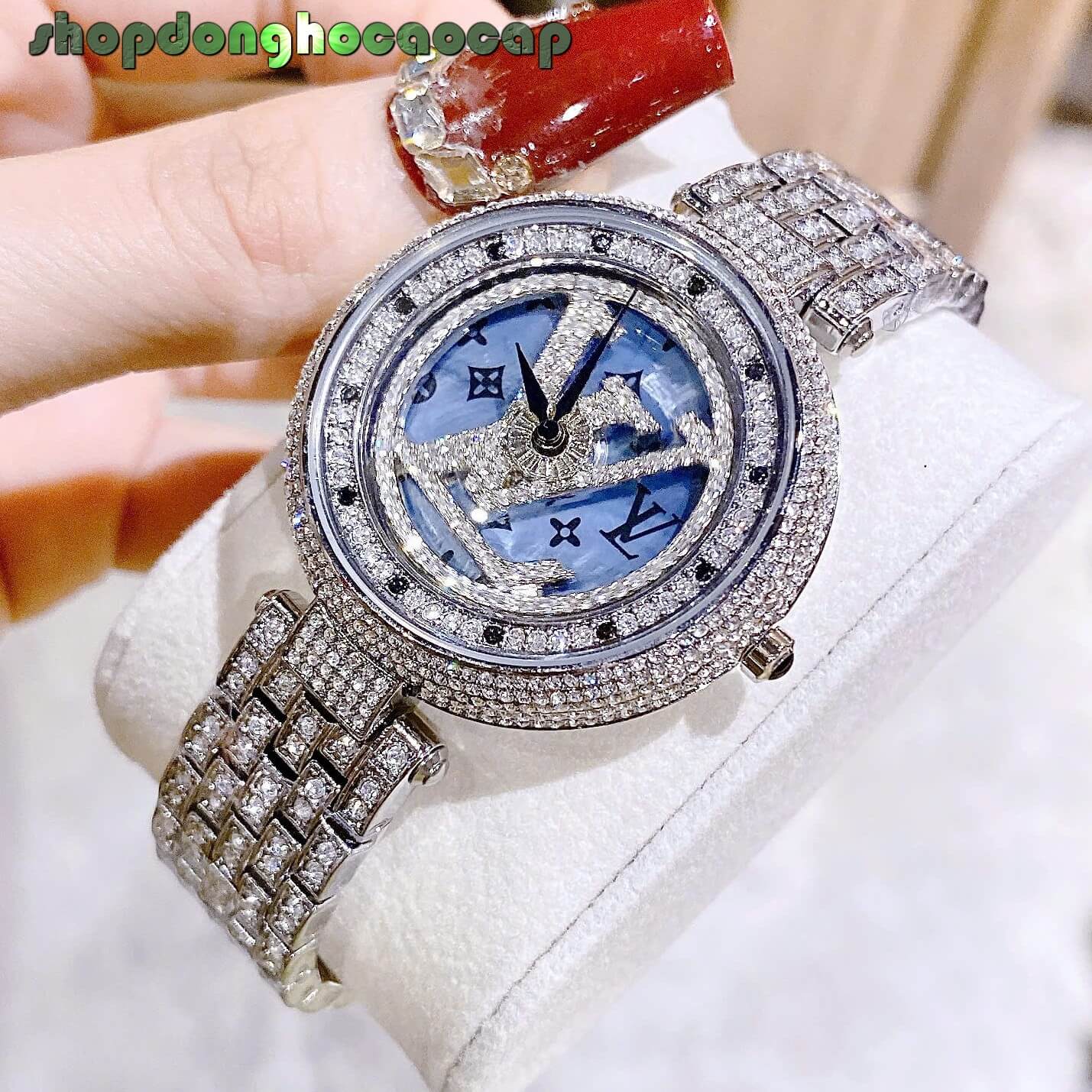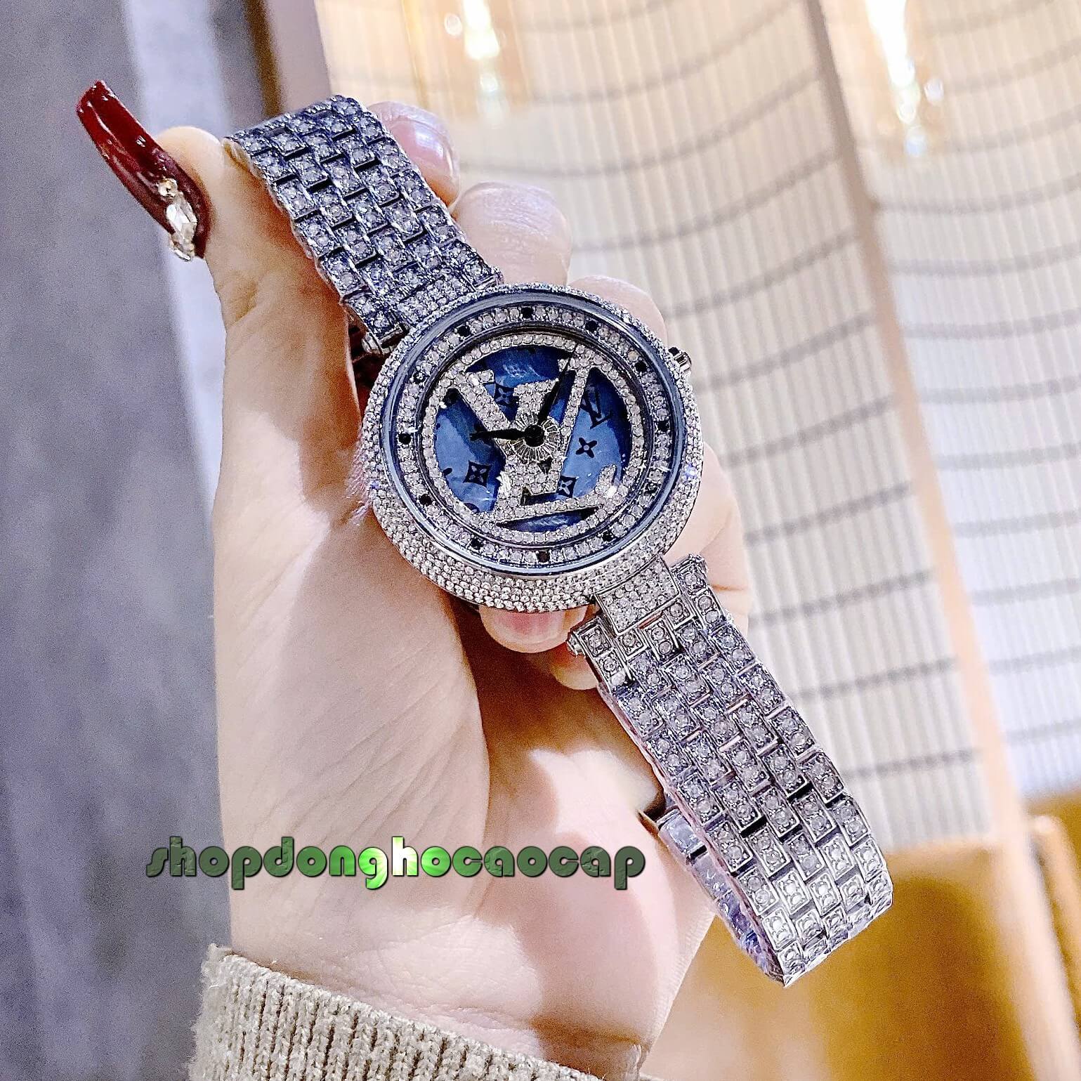 Đồng Hồ Nữ Louis Vuitton Dây Silver Đính Đá Xanh Mặt Xoay Cao Cấp Size 38mm – Quartz