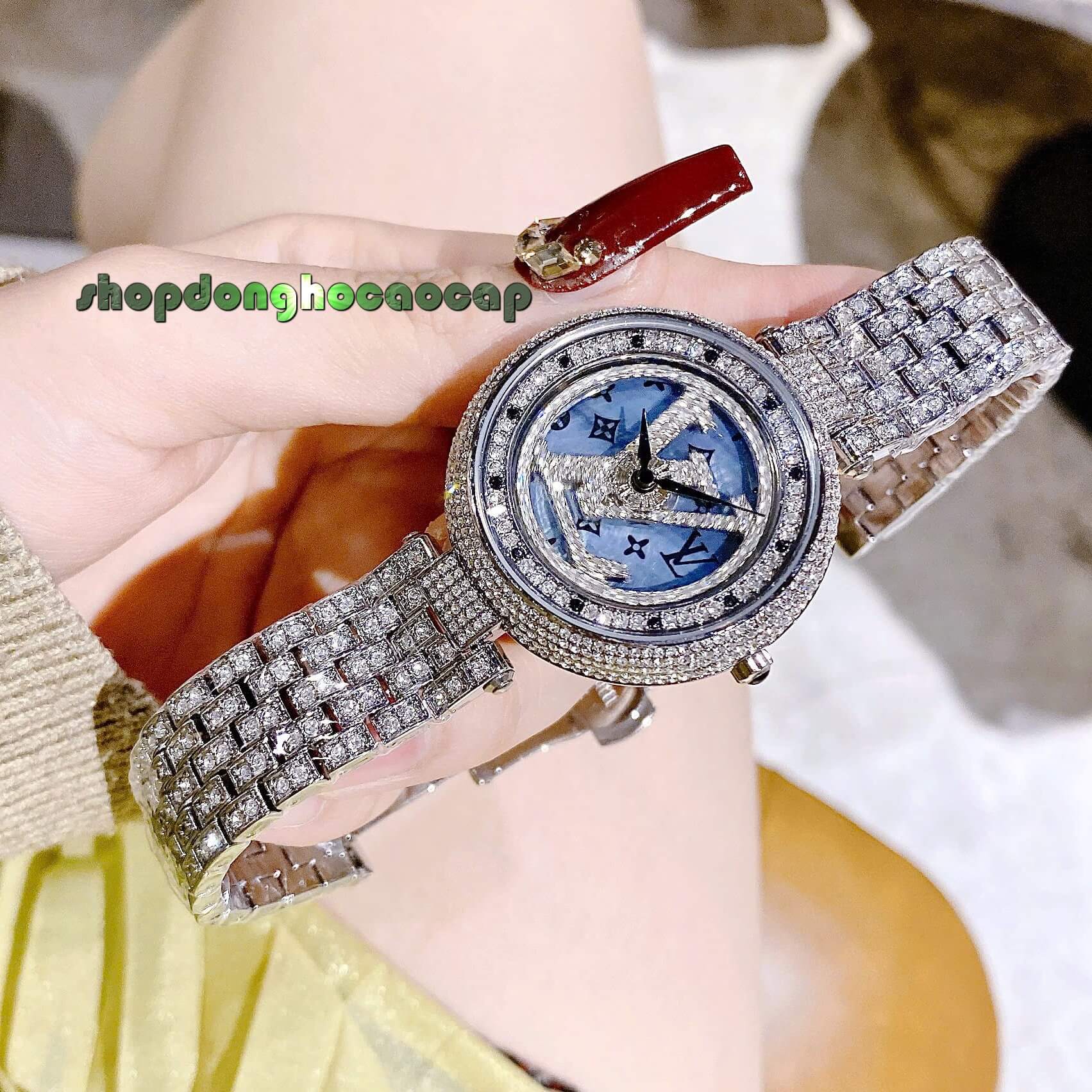 Đồng Hồ Nữ Louis Vuitton Dây Silver Đính Đá Xanh Mặt Xoay Cao Cấp Size 38mm - Quartz