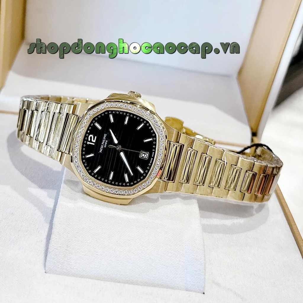 Đồng Hồ Nữ Patek Philippe Nautilus Vàng Gold – Mặt Đen, Viền Đính Đá, Máy Thụy Sĩ, Size 36mm