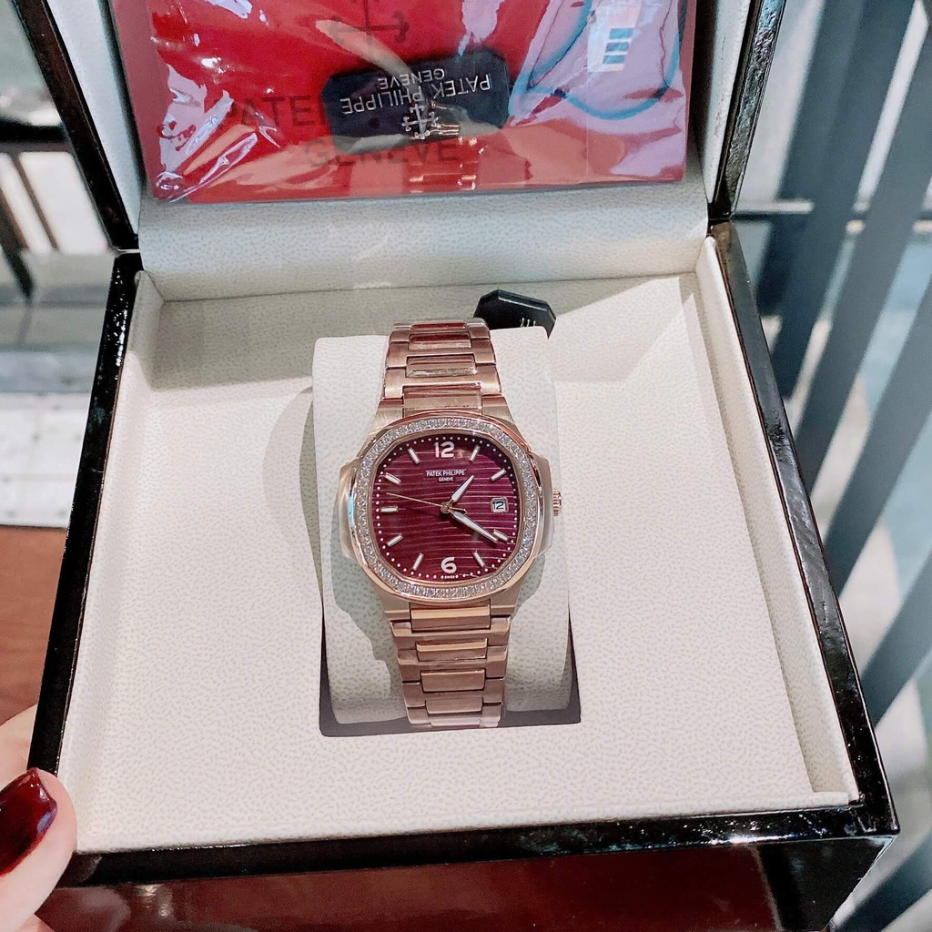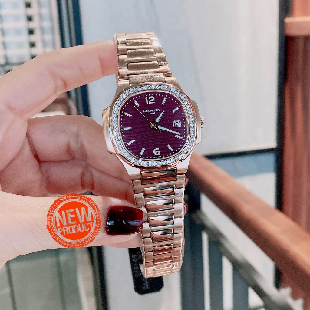 Hình ảnh Đồng Hồ Nữ Patek Philippe Nautilus Dây Kim Loại Màu Vàng Hồng Mặt Hồng Đậm Máy Quartz Thụy Sĩ Size 35.2mm