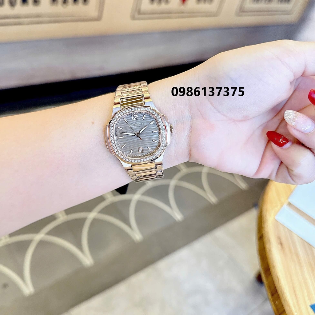 Hình ảnh Đồng Hồ Nữ Patek Philippe Nautilus Màu Rose Gold Mặt Xám Grey Máy Thụy Sĩ Size 36mm - Viền Đá