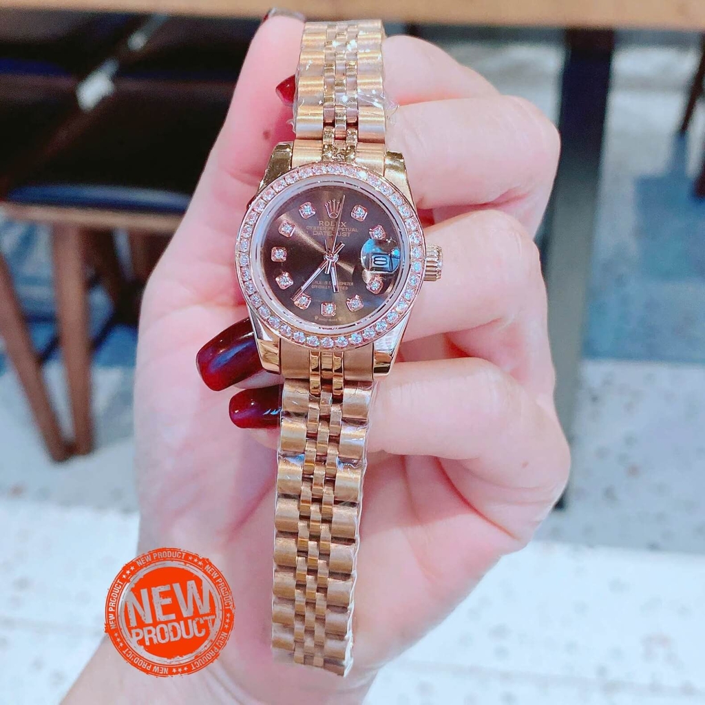 Đồng Hồ Nữ RoLex Datejust Máy Pin Size 28mm – Màu Vàng Hồng Mặt Nâu Viền Đá