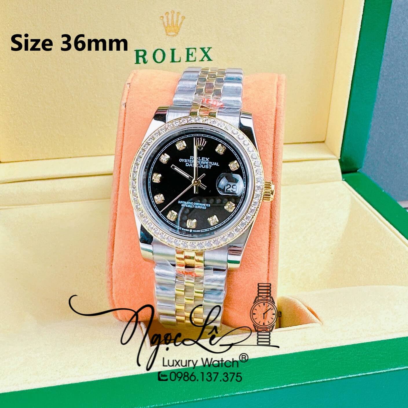 Đồng Hồ Nam Rolex Datejust Pin Dây Kim Loại Demi Vàng Mặt Đen Đính Đá Size 36mm