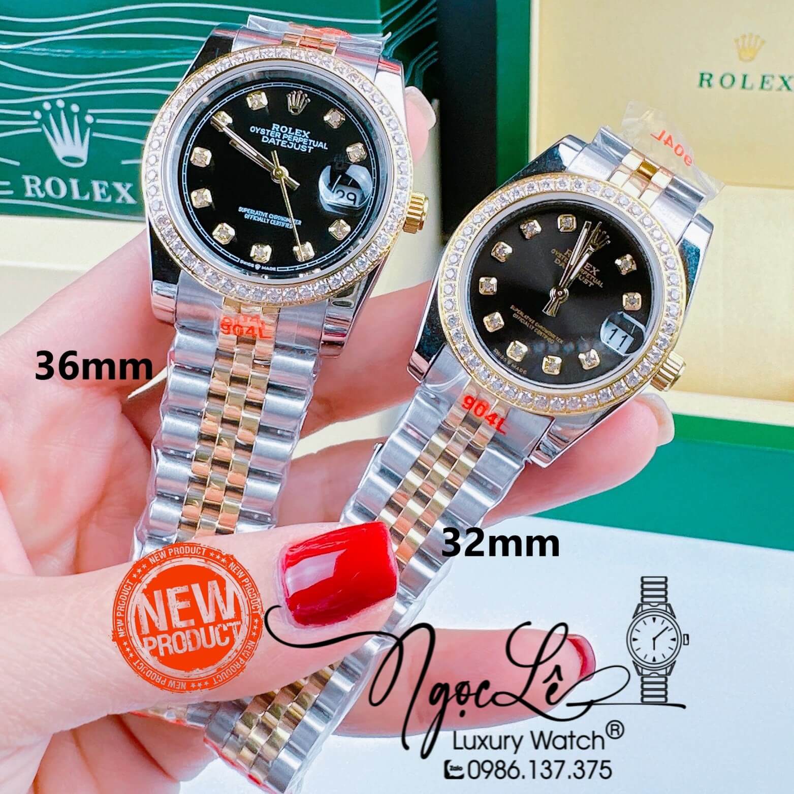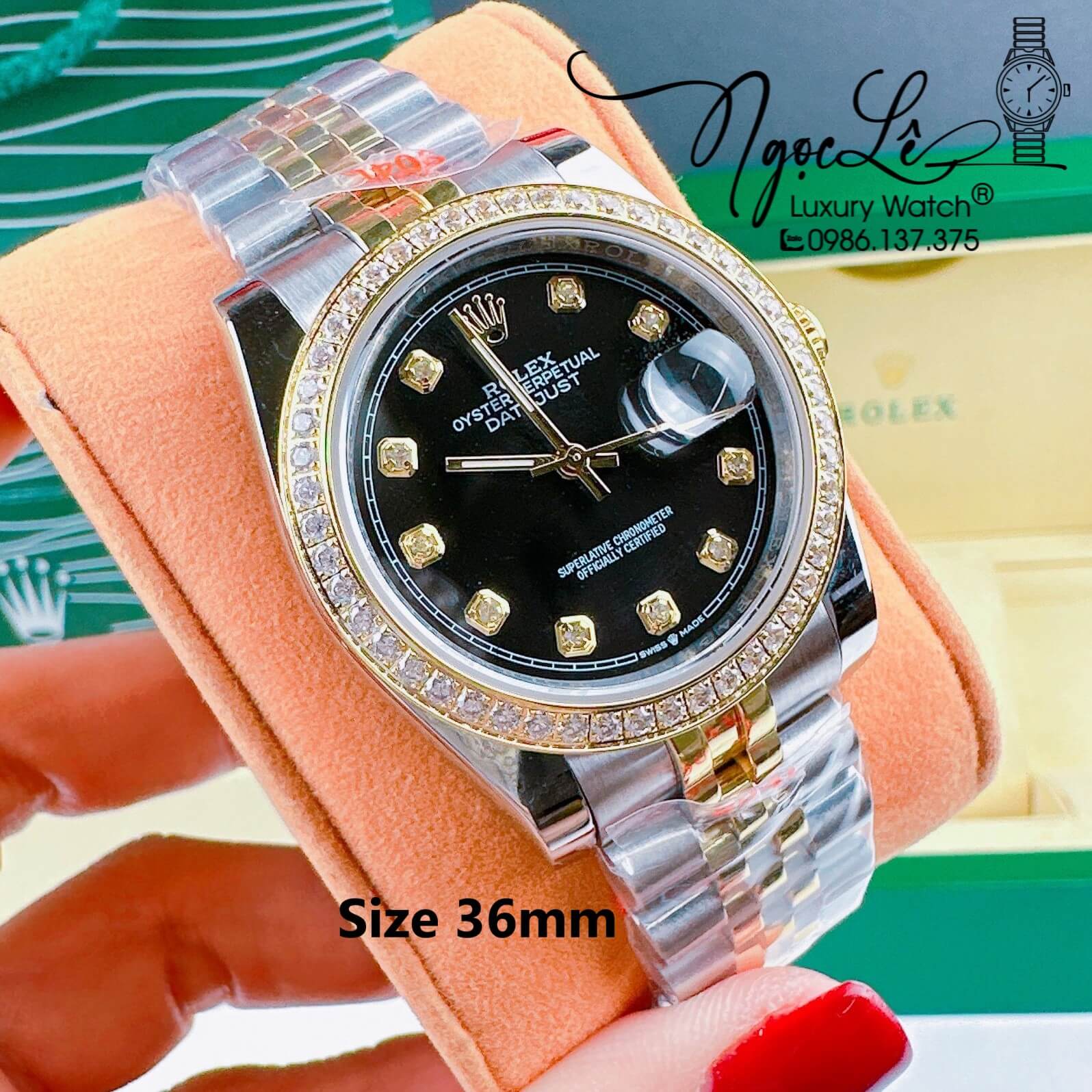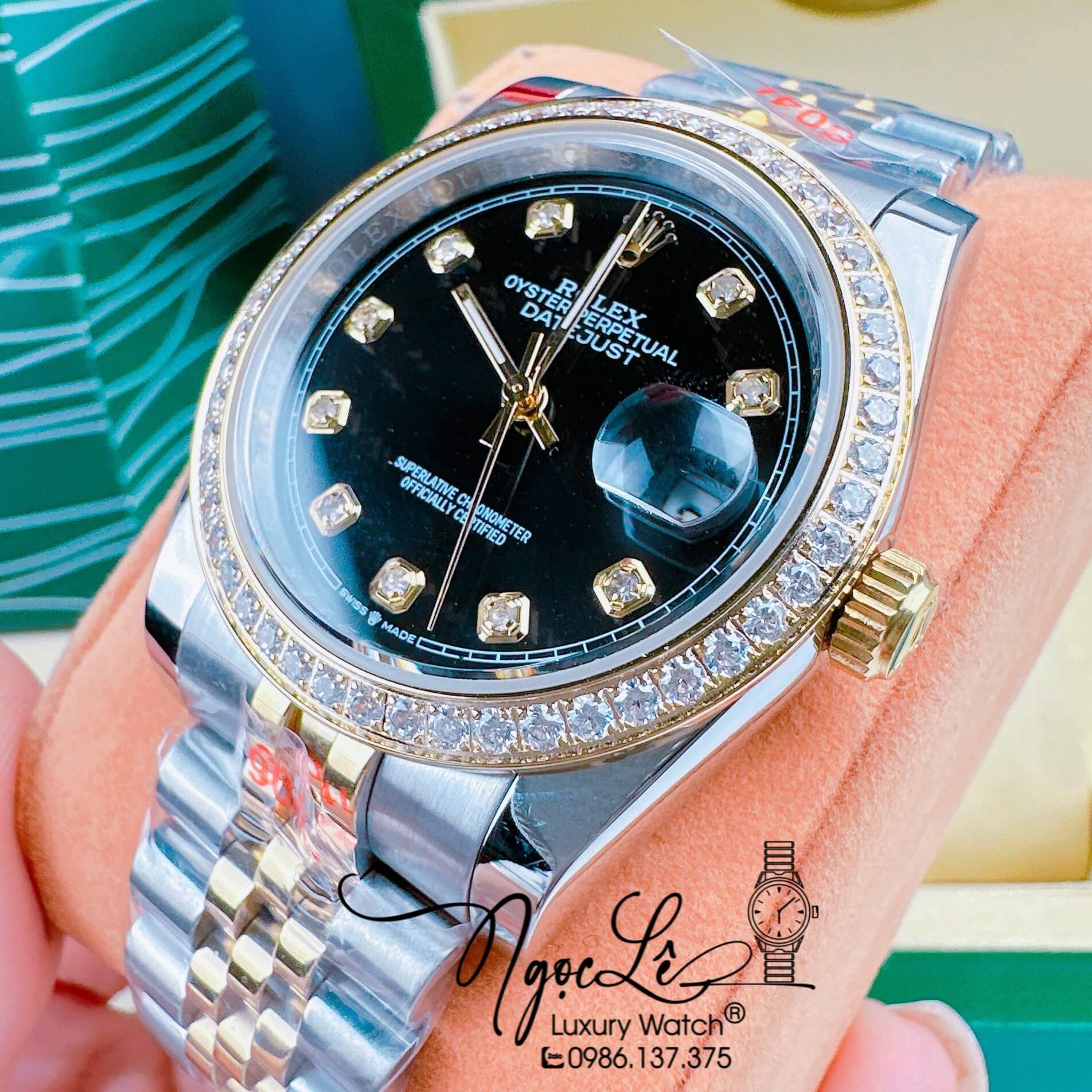 Hình Ảnh Đồng Hồ Nam Rolex Datejust Pin Dây Kim Loại Demi Vàng Mặt Đen Đính Đá Size 36mm