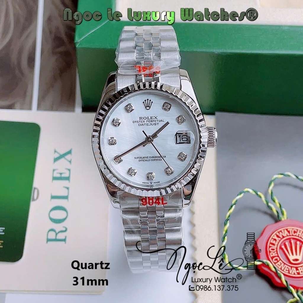 Hình Ảnh Đồng Hồ Nữ Rolex Datejust Pin Dây Kim Loại Silver Niềng Khía Size 32mm - Mặt Trắng Xà Cừ - Đồng hồ Rolex Datejust siêu cấp nữ