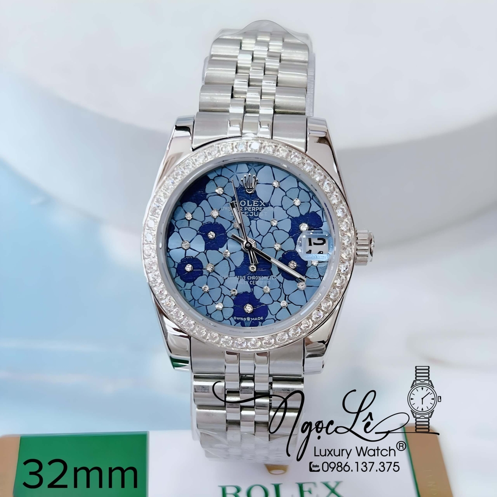 Hình Ảnh Đồng Hồ Nữ Rolex Datejust Pin Màu Bạc Mặt Hoa Xanh Dương Đính Đá Size 32mm - Đồng hồ Rolex Datejust nữ họa tiết hoa đính đá