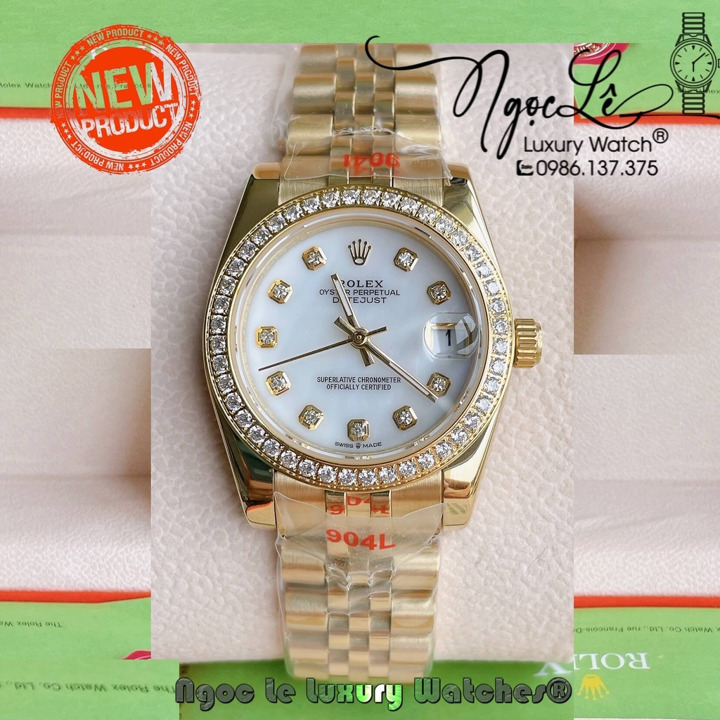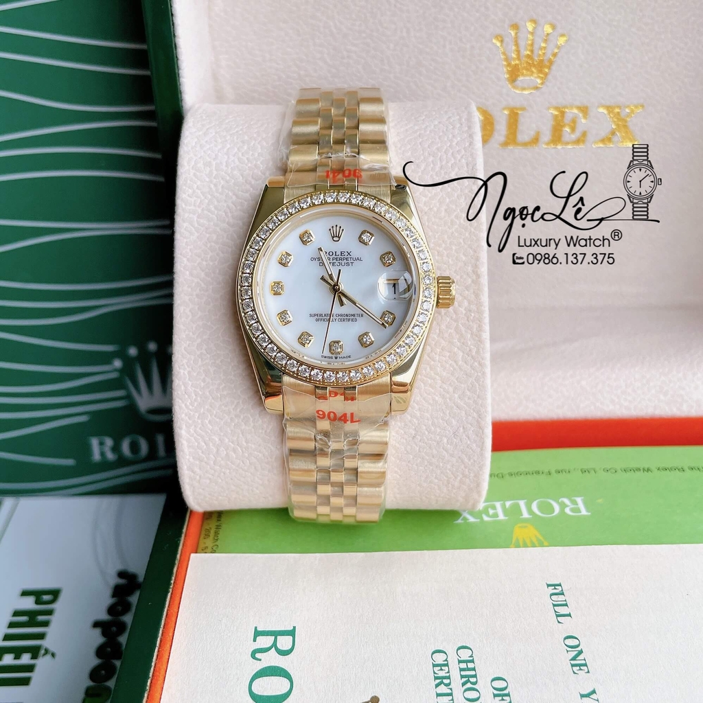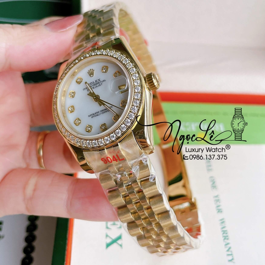 Đồng Hồ Nữ Rolex Datejust Pin Màu Vàng Mặt Trắng Xà Cừ Đính Đá Size 32mm Full Box