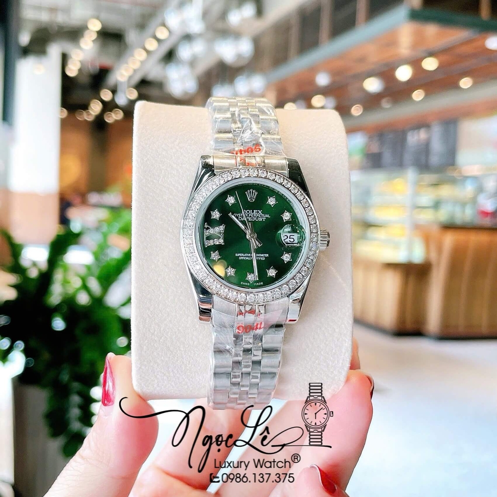 Đồng Hồ Nữ Rolex Datejust Quartz Dây Bạc Mặt Xanh Rêu Size 31mm Đính Đá - Kính Sapphire