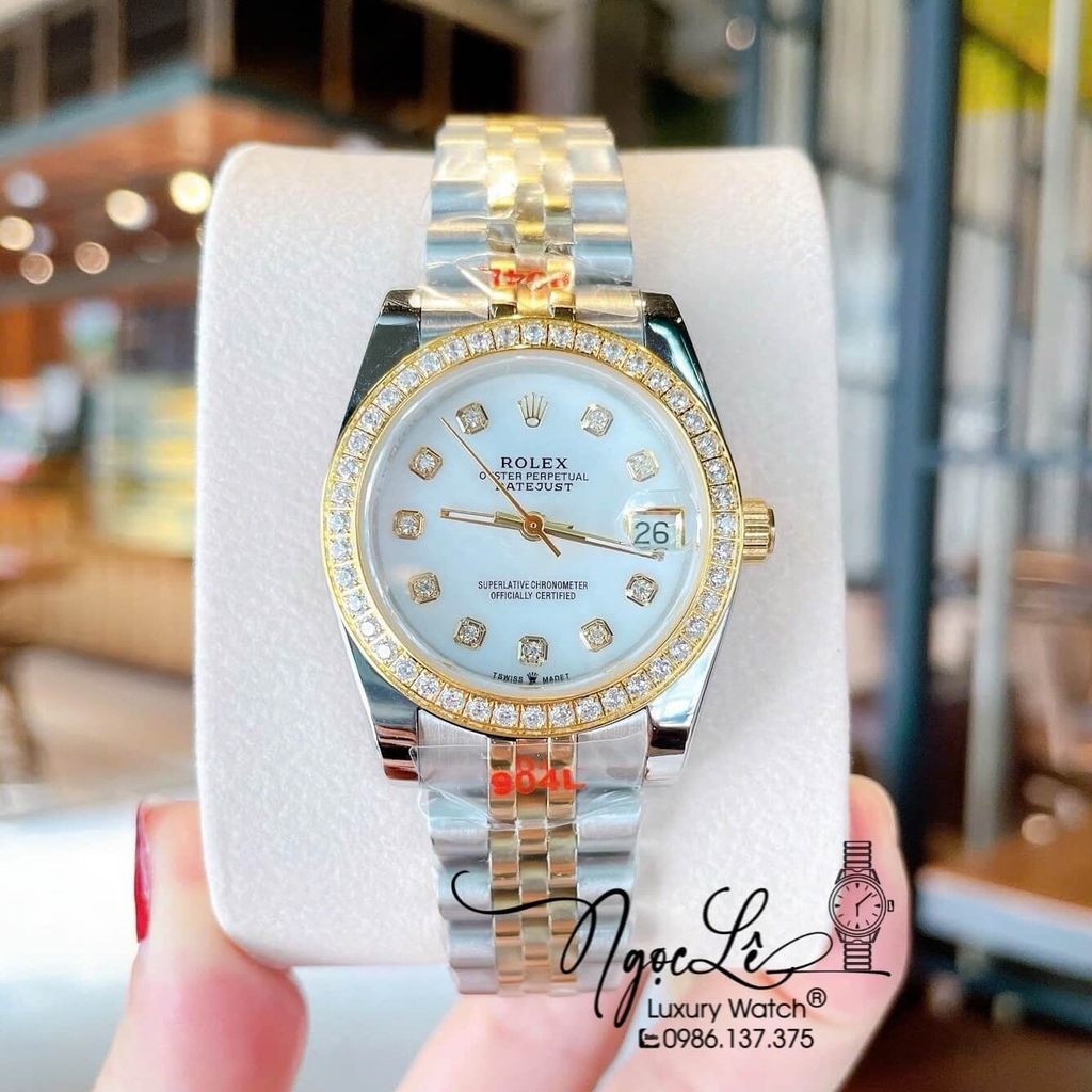 Đồng Hồ Nữ Rolex Datejust Quartz Dây Demi Vàng Mặt Trắng Xà Cừ Size 31mm Đính Đá