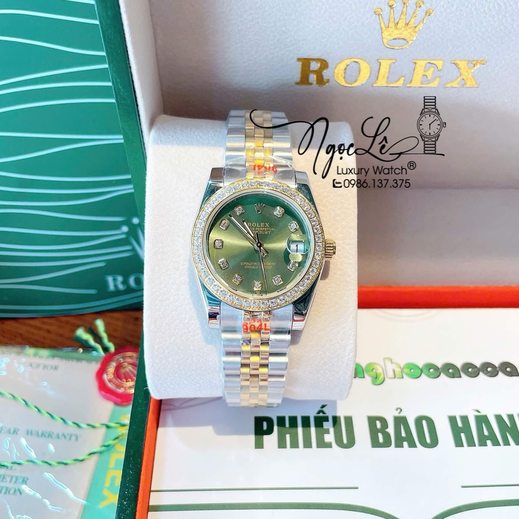 Đồng Hồ Nữ Rolex Datejust Quartz Dây Demi Vàng Mặt Xanh Oliu Size 31mm Đính Đá