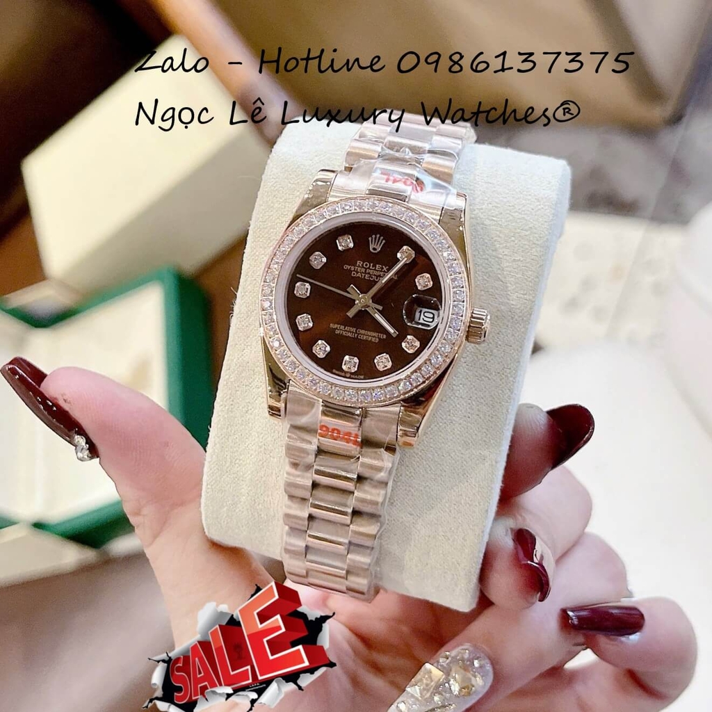 Đồng Hồ Nữ RoLex Datejust Vàng Hồng Mặt Nâu Viền Đá Máy Pin Size 31mm - Đồng hồ Rolex nữ mặt nâu đính 12 viên đá trong mặt thay thế các cọc số