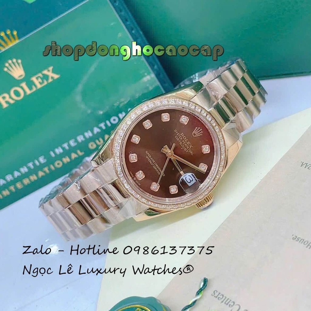 Đồng Hồ Nữ RoLex Datejust Vàng Hồng Mặt Nâu Viền Đá Máy Pin Size 31mm Nhỏ Xinh