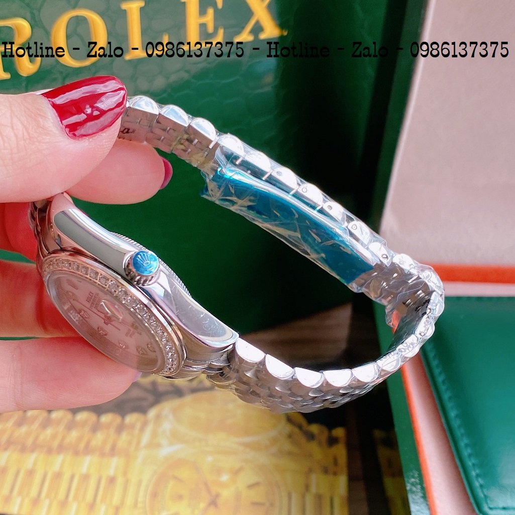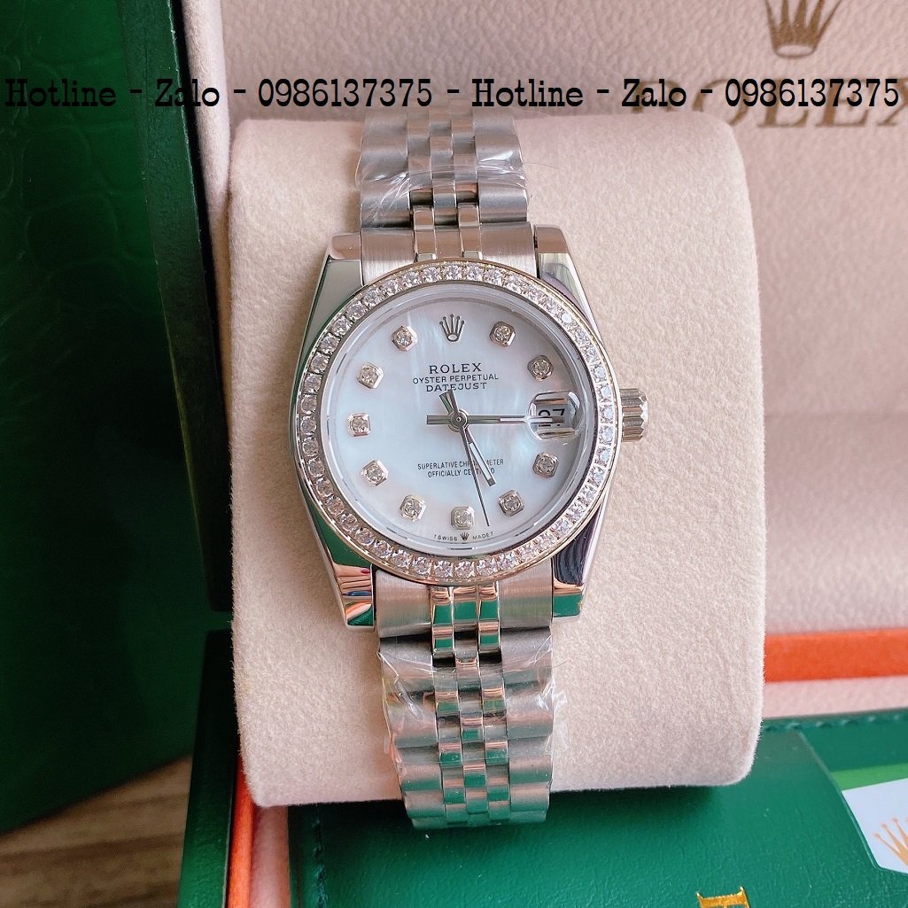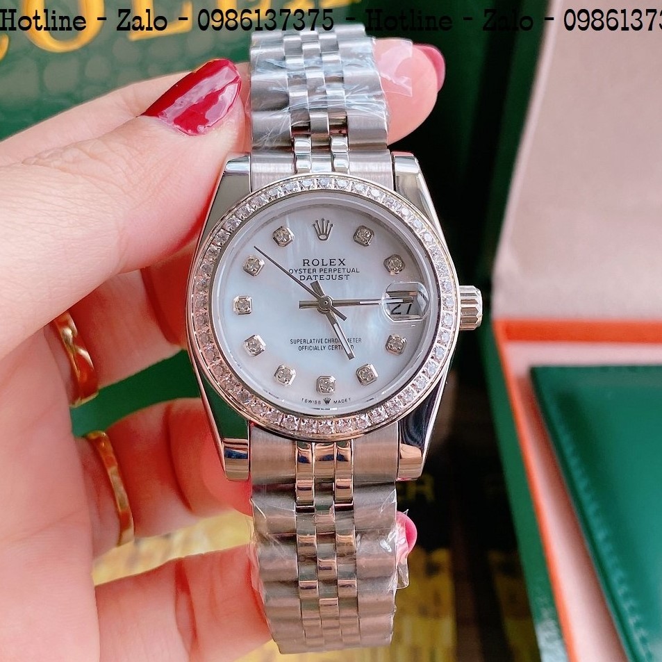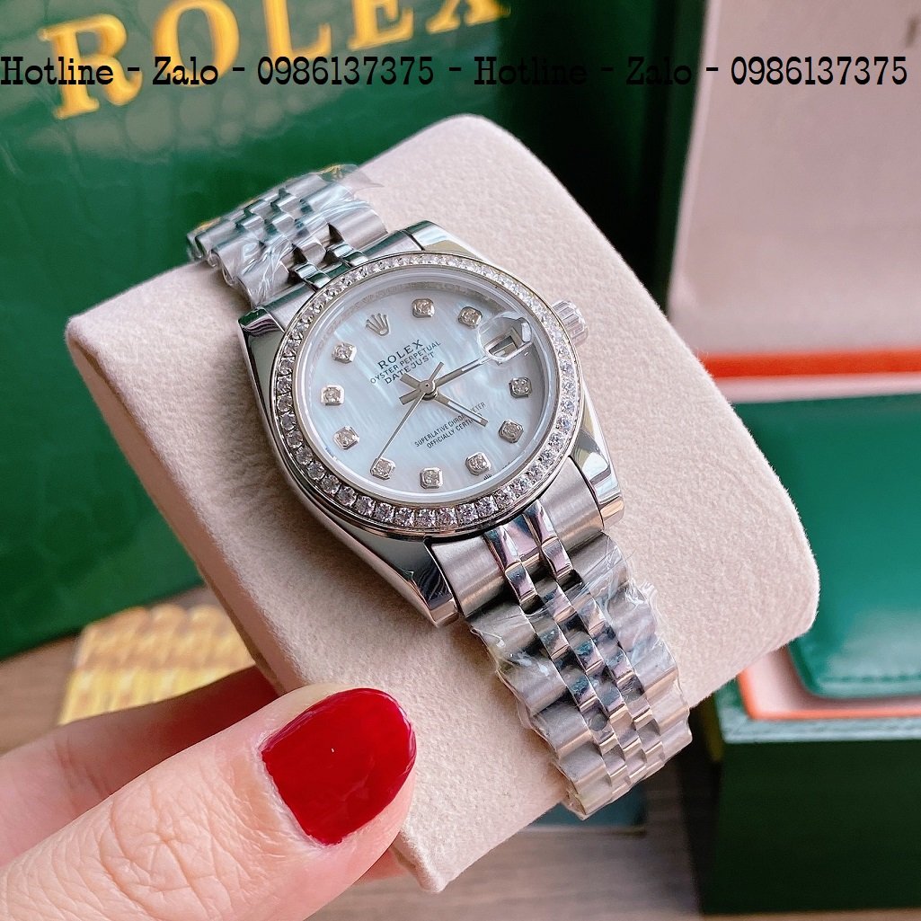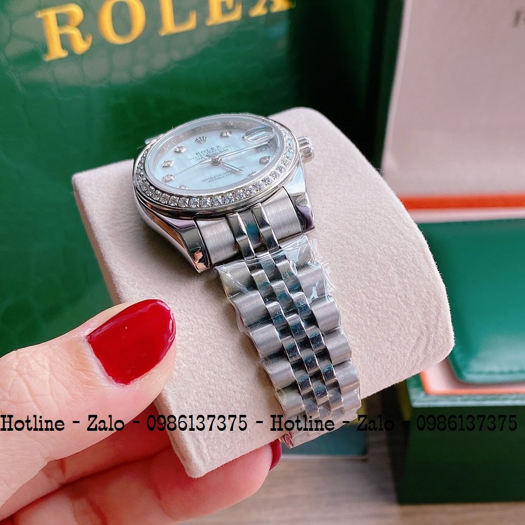 - Đồng Hồ Nữ Rolex Viền Đá Dây Bạc Mặt Trắng Ngọc 32mm