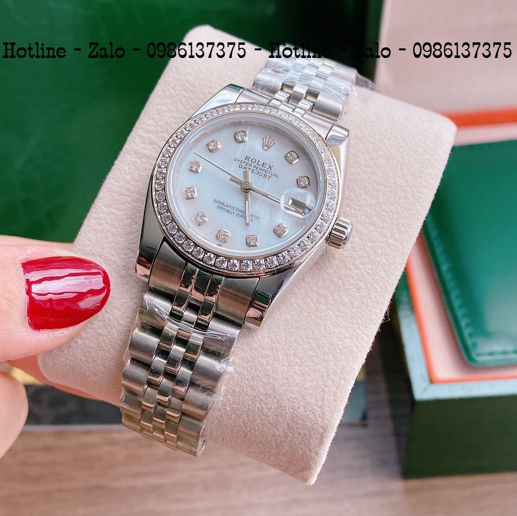 Đồng Hồ Nữ Rolex Viền Đá Dây Bạc Mặt Trắng Ngọc 32mm