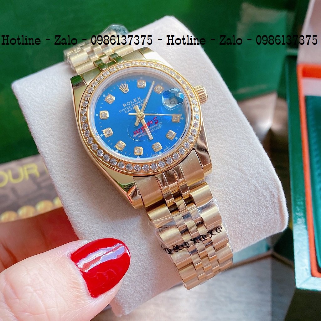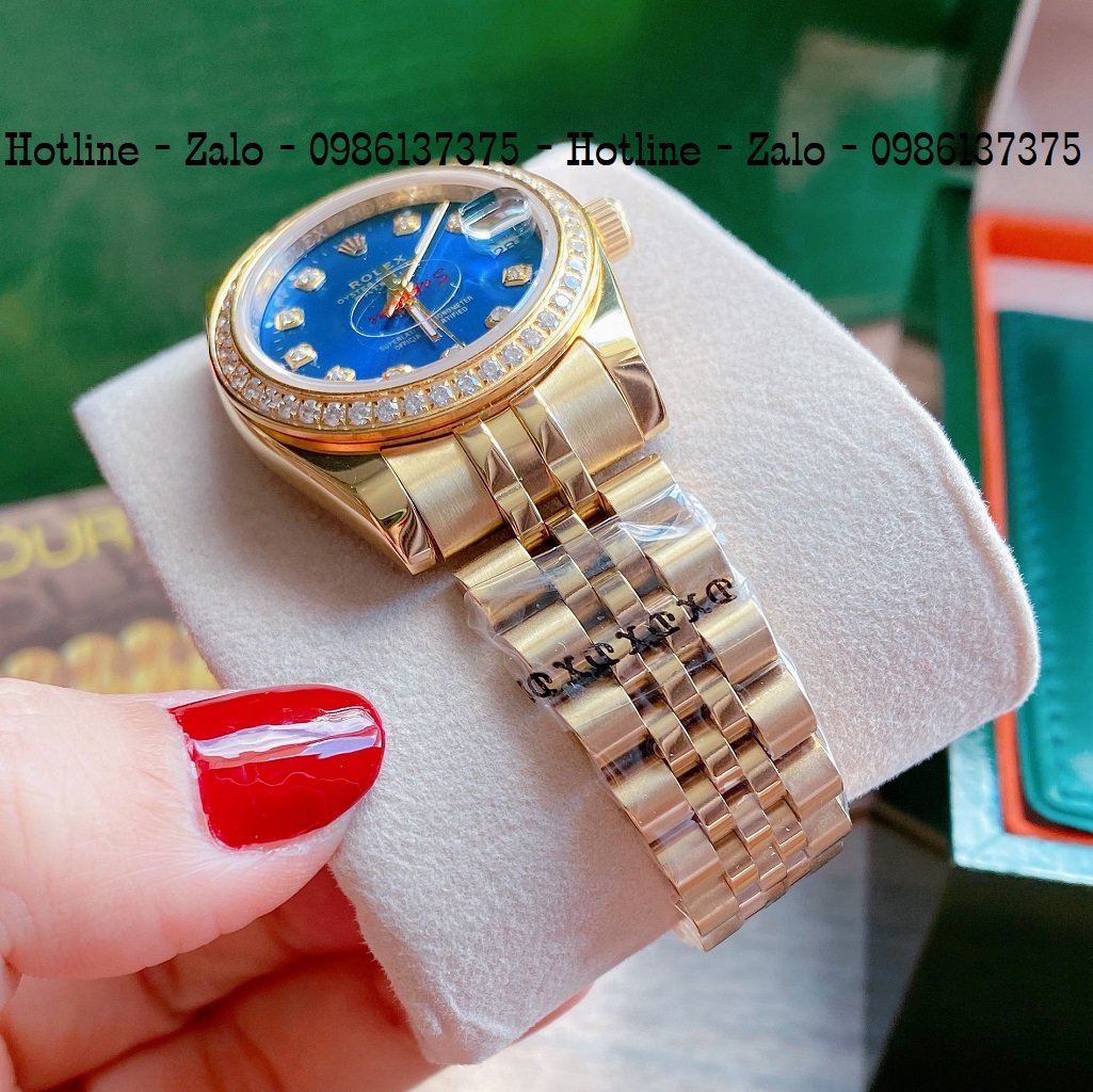 Đồng Hồ Nữ Rolex Viền Đá Dây Vàng Mặt Blue 32mm